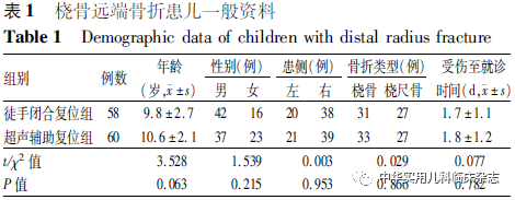 资料与方法1.1 一般材料 回顾性分析。选择2018年4月至2019年8月在华中科技大学同济医学院附属武汉儿童医院门诊、急诊就诊的桡骨远端骨折患儿。纳入标准:(1)X线诊断为桡骨远端骨折;(2)X线片测量骨折成角:9岁以下儿童侧位片成角>20°和/或正位片成角>15°,9~13岁儿童侧位片成角>10~15°和正位片成角>5°,13岁以上儿童侧位片成角>5~10°和正位片成角>5°以及任何程度的缩短[3];(3)采用闭合复位石膏外固定术治疗;(4)治疗过程中采用X线或超声辅助。排除标准:(1)开放性骨折和复合型外伤;(2)病理性骨折;(3)既往患肢骨折病史;(4)直接住院治疗。根据纳入及排除标准,共118例患儿纳入本研究,其中男79例,女39例;年龄(10.2±2.4)岁;左侧41例,右侧77例。根据复位方式不同分为2组,58例行徒手闭合复位(Ⅰ 组),60例行超声辅助复位(Ⅱ 组)。本研究通过医院医学伦理委员会批准(批准文号:2020R041),术前均征得患儿监护人同意并签署知情同意书。1.2 手术方式 Ⅰ 组:在镇静或清醒下,采用徒手闭合复位纠正骨折移位。复位固定后即刻行X线片评估。骨折复位标准,骨折移位及成角纠正为:<9岁儿童侧位片成角15~20°和正位片成角15°;9~11岁侧位片成角10~15°和正位片成角5°;>11~13岁儿童侧位片成角10°和正位片成角0°;>13岁儿童侧位片成角0~5°和正位片成角0°,以及>50%的对位[5]。Ⅱ 组:检查设备为:GELOGIQ e床边超声仪 (GE Healthcare,Milwaukee,WI,USA),配备7.0~12.5 MHz探头(GE Healthcare,Tokyo)。超声采用标准纵向3平面评估骨折部位(桡骨前侧,桡骨后侧,前臂外侧),如有尺骨骨折,增加3平面(尺骨前侧,尺骨后侧,前臂内侧)。探头与尺桡骨面保持垂直,探头长轴与尺桡骨长轴保持平行,超声可显示强回声的骨皮质,获取骨折图像。骨折复位手法与常规徒手复位类似。尝试复位后,使用超声监测骨折复位后情况。超声判断骨折复位标准:骨折断端的强回声骨皮质线对位对线达骨折复位标准。复位过程中超声可实时监测复位情况。最后使用X线片评估石膏固定后骨折复位情况。1.3 术后处理 患儿均采用长臂管型石膏固定。术后每周门诊随访并摄片观察骨折愈合情况。4~6周拆除石膏。患儿早期进行主动功能训练。1.4 疗效评价指标 评价指标包括:门诊就诊时间、拍片次数、复位次数、门诊费用、住院治疗率、术后疼痛评分、骨折愈合时间和改良的Mayo腕关节评分(MMWS)。门诊就诊时间定义为:就诊排号时间至复位后取得摄片结果或开具住院证时间。术后疼痛评分:Wong-Baker面部表情疼痛评定量表由6张面部表情及0~5分构成,0分为无痛,1~2分为轻度疼痛,3~4分为中度疼痛,5分为重度疼痛。骨折愈合标准:(1)局部标准:局部无压痛及纵向叩击痛,局部无反常活动;(2)影像学标准:X线片显示骨折处有连续性骨痂,骨折线模糊。术后采用MMWS[6]标准评定腕关节功能(从4个方面评估):(1)疼痛(25分);(2)满意度(25分);(3)功能活动范围(25分,与健侧的比较百分率);(4)握力(25分,与健侧的比较百分率)。总分:≥90分为优,80~89分为良,65~79分为可,<65分为差。1.5 统计学处理 数据采用SPSS 20.0软件进行统计学分析。正态分布计量资料采用x̄±s表示,计数资料采用率表示。采用t检验、χ2检验、Fisher′s精确检验及Mann-Whitney U检验比较不同辅助方式的一般数据。P<0.05为差异有统计学意义。