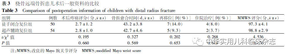 讨论儿童桡骨远端骨折闭合复位石膏外固定的主要辅助方式包括徒手复位和C臂透视。徒手复位常规通过术后X线片来判断骨折的复位情况,具有简单快捷、治疗费用低等优点,但复位的成功率往往受限于医师经验。C臂透视辅助复位的成功率高,但多数医院门诊未普及C臂机,无法在基层开展,且医师及患者有暴露辐射风险[7]。本课题组前期研究表明,超声是一种有效的诊断桡骨远端骨折的检查方式[8],具有操作方便、无放射线暴露的特点。本研究通过3个标准面的超声图像可以清楚地观察到桡骨骨皮质强回声连续性改变,准确判断复位效果,并获得了良好的临床效果。本研究中超声辅助闭合复位成功率为88.1%,与文献报道的结果相似[3,9]。赵丽等[10]发现超声较C臂透视辅助在初次闭合复位的成功率和总成功率方面均有明显优势。本研究结果亦显示2组间初次复位成功率有统计学差异,超声辅助可提高初次闭合复位的成功率。然而,Chinnock等[11]比较急诊医师采用超声与常规X线辅助骨折复位,并指出2组总复位成功率相似。本研究结果同样显示超声辅助并未增加总复位成功率,2组住院治疗率比较差异无统计学意义。但超声辅助组在术后功能恢复上具有明显优势。这与超声辅助能提高骨折复位质量有关[12]。本研究结果表明,2组间门诊就诊时间有明显统计学差异,超声辅助闭合复位明显缩短患儿门诊就诊时间,节约医疗资源。既往研究结果显示,接受骨折闭合复位儿童的平均就诊时间为3.10~8.77 h[3]。虽然本研究未量化超声检查时间,但既往研究中[13-14],超声检查所需的平均时间为0.8~10.0 min,X线检查所需的平均时间为30 min以上,患儿接受超声诊断可明显缩短检查的时间。超声辅助可同时完成诊断和疗效判断,明显减少总复位次数,从而明显缩短诊疗时间。超声能实时判断骨折的复位质量,同时复位失败的病例可直接住院治疗,减少术后拍片次数。另外,本研究显示超声辅助复位组的总门诊费用少于徒手闭合复位组,但2组比较差异无统计学意义。尹龙等[15]报道,住院麻醉下手法复位治疗桡骨远端骨折的平均花费为2 000.4元。本研究结果表明,门诊超声辅助复位可降低住院医疗花费,适合在基层医院应用。本研究结果显示,2组术后疼痛评分差异无统计学意义。Chaar-Alvarez等[14]同样采用Wong-Baker面部表情疼痛评定量表评分,结果显示X线检查的疼痛(平均1.7分)和超声检查的疼痛(平均1.2分)无差异。Poonai 等[13]研究显示,超声检查的疼痛平均1分,X线检查的疼痛平均2分。因此,超声辅助未额外增加手法复位的疼痛,疼痛不会限制超声在门诊治疗桡骨远端骨折中的应用。再移位是骨折复位术后最重要的并发症,发生率高达 45.7%[16]。本研究中再移位发生率为11.5%,与国内报道类似[15]。导致骨折再移位发生的危险因素仍存在争议,可能与完全移位的骨折、粉碎性骨折、斜型骨折、石膏固定技术、复位质量及手术医师的经验有关[17]。解剖复位是避免再移位的重要因素[18]。虽然本研究认为超声评估骨折复位后质量更有优势,再移位发生率低,但2组差异无统计学意义;有1例患儿闭合复位后超声显示复位良好,但石膏固定后复查X线再移位,考虑为石膏固定过程中再移位,张敬东等[9]同样报道了2例石膏固定过程中的骨折再移位。本研究也存在一些局限性。首先,样本量小,研究时未能细分骨折类型,同时回顾性研究存在选择偏倚,因此需前瞻性对照研究以确定2种方式的疗效。其次,本研究单位无门诊C臂机,未纳入相关的病例,但与C臂透视相比,超声具有无辐射暴露的优势[19]。综上,本研究结果表明,超声辅助闭合复位具有提高初次复位成功率、缩短门诊就诊时间、减少X线拍片次数、术后功能恢复好和不增加患儿术后疼痛的优势。超声辅助闭合复位是门诊处理儿童桡骨远端骨折的一种有效方式。