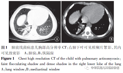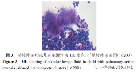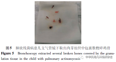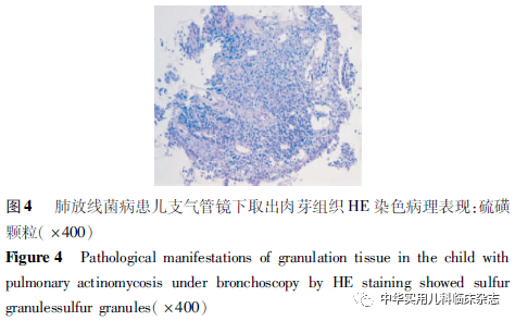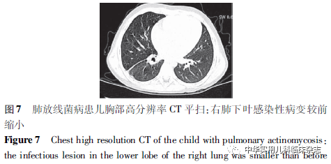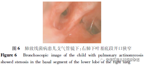 临床资料回顾性研究。患儿,女,6岁9个月,因确诊“地中海贫血”6年余,拟行造血干细胞移植术,于2018年9月4日入院。患儿自入院前6年因贫血确诊为“β地中海贫血(重型,CD41-42纯合子)”,后长期规律输血,维持血红蛋白在90 g/L以上。此次入院为造血干细胞移植术前评估。患儿病程中无反复发热,无反复咳嗽,近期无发热、咳嗽,无气促、呼吸困难等呼吸道症状。患儿为第1胎,第1产,足月,顺产,出生体质量 2 600 g。既往无特殊病史,患儿父母均为轻型β地中海贫血患者,个人史、传染病史均无特殊,否认异物吸入史。入院后体格检查:体温36.6 ℃,心率96次/min,呼吸20次/min、体质量19.9 kg,血压104/65 mmHg(1 mmHg=0.133 kPa)。面色稍苍白,呼吸平顺,未见三凹征,双肺呼吸音对称,呼吸音清,未闻及啰音。肝脏肋下2 cm,质软,边界清;脾脏肋下2 cm。其他系统查体未见异常。实验室检查:白细胞7.8×109/L、红细胞 2.9×10 12 /L、血红蛋白81 g/L、碱性磷酸酶27.38 μg/L、血清铁蛋白1 675.00 ng/L、余结果未见异常。结核菌素试验72 h阴性。结核免疫分析未见异常。呼吸道病原未送检。入院后首次胸部高分辨率CT(HRCT,层厚0.625 mm)平扫示:右肺下叶可见模糊片絮影,以后基底段为著,其内可见致密影(图1)。常规通气肺功能检查示:小气道功能下降。诊治及随访过程:为明确病因,HRCT结果回报后即行支气管镜检查。镜下发现右肺下叶基底段肉芽组织增生。肺泡灌洗液HE染色提示:可见放线菌菌团。过碘酸雪夫染色(PAS染色)及六胺银染色均显示:放线菌阳性。明确诊断肺放线菌病后,予阿莫西林克拉维酸钾分散片口服治疗1个月后,至外院复查胸部CT提示较前有好转,患儿监护人自行停药后未再来深圳市儿童医院复诊。停药9个月后,来深圳市儿童医院输血治疗,复查胸部HRCT示:右肺下叶仍可见大片状,右肺下叶后基底段支气管壁内高密度影基本同前。第2次气管镜下仍可见右肺下叶基底段肉芽组织增生(图2),且右肺下叶基底段狭窄。肺泡灌洗液HE染色提示:仍可见放线菌菌团(图3)。予气管镜下冷冻治疗,取部分肉芽组织行病理检查,可见成团“硫磺颗粒”(图4);取出所有肉芽组织,发现数块碎鸡骨包裹在其中(图5)。后予阿莫西林舒巴坦钠静脉滴注治疗2周后出院,予阿莫西林克拉维酸钾分散片口服序贯治疗6个月。随访约1年,定时复查胸部CT及气管镜,气管镜提示:右肺下叶外基底段开口明显狭窄(图6),肺泡灌洗液HE染色未再发现放线菌;最近1次胸部HRCT示:右肺下叶感染性病变较前缩小(图7)。本研究经医院医学伦理委员会审批通过[批准文号:深儿医伦审(文章)2020(019)号],患儿监护人对所做研究均知情同意,并签署知情同意书。