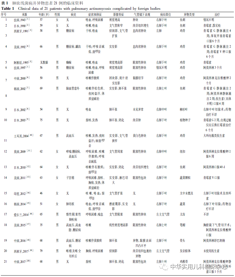 文献检索 以“放线菌”、“异物”作为关键词,在万方中文数据库中检索;以“actinomycosis”、“foreign body”为关键词在PubMed数据库中检索,截至2020年9月,共检索到国内外20篇文献,共报道21例异物合并放线菌感染的病例,全部为个案报道,且均为成人病例,暂未检索到儿童病例。本研究总结了这些病例的年龄、性别、基础疾病、临床表现、影像及气管镜表现、治疗随访情况(表1)。