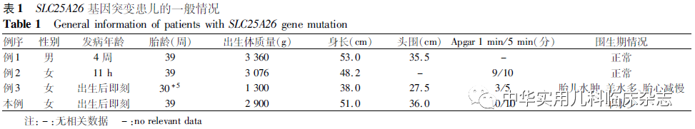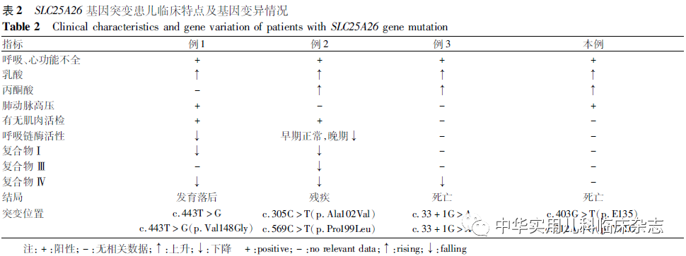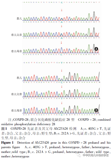 讨论COXPD-28是一种由于基因SLC25A26(OMIM:611037)突变导致的常染色体隐性遗传的多系统疾病,该基因位于染色体3p14.1,包含7个外显子和8个内含子,该基因编码一种线粒体载体,该载体属于主要存在于线粒体内膜的转运蛋白家族[1,4,8-9] 。这些蛋白质使代谢物和辅酶因子穿梭于线粒体膜,SLC25A26负责S-腺苷蛋氨酸的运输进入线粒体,它是由三磷酸腺苷(ATP)和蛋氨酸在蛋氨酸腺苷转移酶的作用下合成的。这些合成代谢反应发生于全身各处,S-腺苷蛋氨酸是几乎所有生物甲基化反应的甲基供体。在线粒体中,它是DNA、RNA和蛋白质甲基化所必需的,该基因缺陷,会导致RNA和蛋白质的线粒体内甲基化减少、翻译减少以及辅酶Q和硫辛酸水平降低,导致线粒体功能障碍[4,8,10-12] ,而线粒体是细胞进行氧化磷酸化、合成ATP的主要场所,线粒体功能障碍患儿可能出现呼吸功能不全,乳酸酸中毒,急性发作的心肺疾病和进行性肌无力等症状[5-6,13-15] 。该疾病临床表型多样,新生儿期常见表现特征为呼吸衰竭、心力衰竭、重度乳酸酸中毒、胎儿期情况多有羊水过多、胎动减少等情况,导致患儿新生儿期死亡,婴儿期发病多有发育迟缓、食欲不振、血清乳酸增高、全身性肌张力减低、线粒体复合物活性降低、疲乏、肌无力、腹痛[4,6] 。文献报道肌肉活检多有线粒体复合物 Ⅰ、Ⅲ、Ⅳ活性降低[4,9,16-17] ,本例患儿父母不同意肌肉活检,未做组织学验证。线粒体肌病的诊断依赖于多种技术的结合,包括传统的组织化学、免疫组织化学、生物化学检测结合基因测序。组织肌肉活检多见破碎红纤维,酶学线粒体复合物Ⅰ、Ⅲ、Ⅳ活性降低。文献报道,该病是由于基因SLC25A26纯合突变或者复合杂合突变所致,通过患者原代成纤维细胞进行功能验证,最终确定其致病[4] 。本例患儿SLC25A26基因发生c.403G>T和c.212A>G复合杂合变异,其中SLC25A26基因c.403G>T变异来自父亲,该变异使对应密码子变异为终止密码子,导致蛋白功能改变,为可能致病突变,SLC25A26基因c.212A>G变异来自母亲,为非同义变异,尚未见报道,临床意义不明,但该变异对基因或基因产物造成有害影响,有待蛋白功能的进一步验证。该病目前尚无特效治疗办法,仅对症支持治疗,预后较差,对于新生儿期不明原因出现酸中毒、呼吸循环衰竭情况,不明原因患儿死亡,先天性遗传代谢问题可能性大[18-19] ,应尽早行基因检测明确遗传学病因,对优生优育提供帮助。