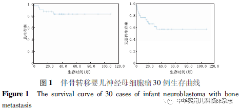 神经母细胞瘤(NB)是外周交感神经系统的胚胎肿瘤,是儿童最常见的颅外实体瘤,也是婴儿最常见的癌症,占所有儿童癌症死亡的15%[1-2]。原发肿瘤约70%位于腹部(40%位于肾上腺髓质,25%位于交感神经节)[3],在诊断时,约50%的患者出现转移,通常在骨髓或骨骼。婴儿NB中,转移病灶仅限于皮肤、肝脏和/或骨髓定义为4S期[4],4S期的特点是疾病发展良好,自发性肿瘤消退率高,长期生存率估计在65%~92%[5]。伴骨转移NB定义为4期,多见于18个月以上的患儿,且总体预后差,生存率约为50%[6]。而年龄是决定预后的一个最重要的因素,<1岁的患儿5年生存率明显较高[7]。因此本研究对2010年1月至2019年12月首都医科大学附属北京儿童医院收治的伴骨转移的婴儿NB进行回顾性分析,以了解其临床特征及预后影响因素。