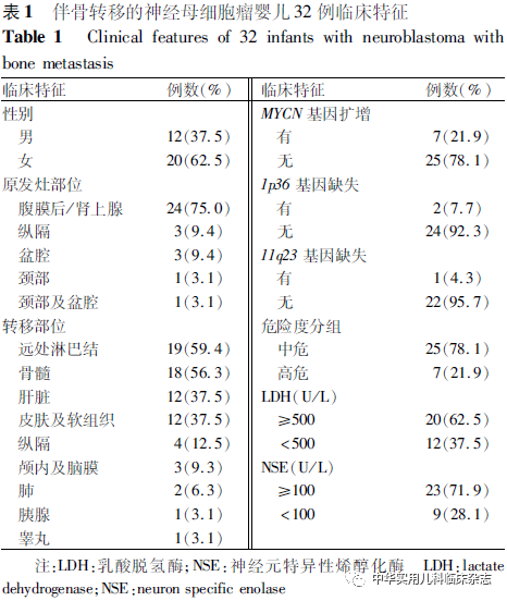 结果2.1 一般资料 2010年1月至2019年12月共收治NB婴儿200例,其中32例伴骨转移,占同期诊断婴儿NB的16.0%(32/200例)。其中男12例(37.5%),女20例(62.5%);中位发病年龄9个月(4.5~12.0个月)。其中19例远处淋巴结转移(59.4%)、18例骨髓转移(56.3%)、13例肝转移(40.6%)、12例皮肤及软组织(37.5%)、4例纵隔转移(12.5%)、3例颅内及脑膜(9.4%)、2例肺转移(6.3%)、1例胰腺转移(3.1%)、1 例睾丸转移(3.1%)。原发部位主要为肾上腺/腹膜后来源者24例(75.0%)、纵隔来源者3例(9.4%)盆腔来源者3例(9.4%)、颈部来源者1例(3.1%)、颈部及后纵隔来源者1例(3.1%)。伴N-myc基因扩增者7例(21.9%),1P36 检测者26例,其中缺失者2例(7.7%%),11q23检测者23例,其中缺失者1例(4.3%)。初诊时患儿血清乳酸脱氢酶(LDH):12例LDH<500 U/L、20例LDH≥500 U/L;血清神经元烯醇化酶(NSE):9例<100 U/L、23例≥100 U/L。患儿基本临床特征见表1。