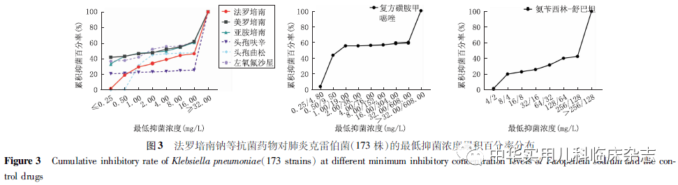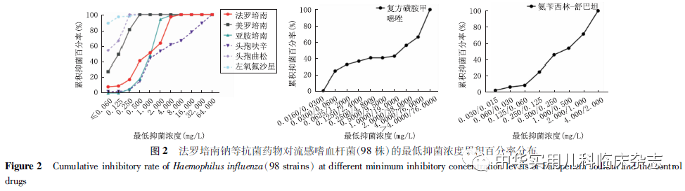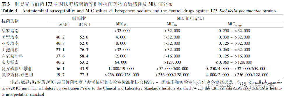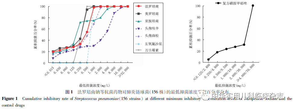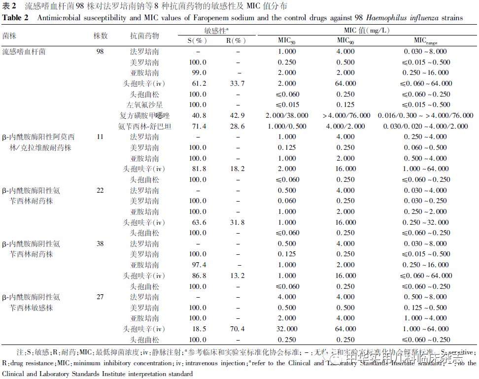 资料与方法1.1 实验菌株 回顾性分析。肺炎链球菌、流感嗜血杆菌、肺炎克雷伯菌、卡他莫拉菌临床株为实验室保存的2016年4月至2021年3月自北京儿童医院收集的临床分离菌。为更全面评估法罗培南钠的实用价值,根据既往研究数据,针对肺炎链球菌(156株)选取青霉素敏感[PSSP,最低抑菌浓度(MIC)≤0.060 mg/L]32株,青霉素中介(PISP,0.125 mg/L≤MIC≤1.000 mg/L)28株,青霉素耐药(PRSP,MIC≥2.000 mg/L)96株;针对流感嗜血杆菌(98株),选取β-内酰胺酶阳性阿莫西林/克拉维酸耐药株(BLPACR)11株,β-内酰胺酶阳性氨苄西林耐药株(BLPAR)22株,β-内酰胺酶阴性氨苄西林耐药株(BLNAR)38株,β-内酰胺酶阴性氨苄西林敏感株(BLNAS)27株;肺炎克雷伯菌(173株)和卡他莫拉菌(55株)为连续收集的临床分离株,未进行菌株筛选。本研究使用的质控菌株包括肺炎链球菌ATCC 49619、流感嗜血杆菌ATCC 49247、金黄色葡萄球菌ATCC 29213和大肠埃希菌ATCC 25922。1.2 主要试剂 小儿法罗培南钠由日本玛路弘株式会社提供原药,亚胺培南购自大连美仑生物技术有限公司,美罗培南、头孢呋辛、头孢曲松、左氧氟沙星、磺胺甲噁唑、甲氧苄啶、氨苄西林、舒巴坦、万古霉素、庆大霉素皆购于中国食品药品检定研究院,MH琼脂(MHA)培养基和胰酪大豆胨琼脂(TSA)培养基购自英国OXIOD公司,脱纤维羊血购自北京兰博利德生物技术有限公司。1.3 菌株复苏 将肺炎链球菌ATCC 49619及156株肺炎链球菌临床分离株、流感嗜血杆菌ATCC 49247及98株流感嗜血杆菌临床分离株、金黄色葡萄球菌ATCC 29213、卡他莫拉菌临床分离株划线法接种于含5%(v/v)脱纤维羊血的TSA琼脂平板;将大肠埃希菌ATCC 25922及173株肺炎克雷伯菌临床分离株划线法接种于TSA琼脂平板;置于二氧化碳恒温孵箱,(35±2) ℃培养18~24 h进行菌株复苏。1.4 菌悬液制备 挑取细菌单菌落,将大肠埃希菌ATCC 25922及肺炎克雷伯菌临床分离株接种于MHA平板;其余细菌接种于含5%(v/v)脱纤维羊血的MHA平板;置二氧化碳恒温孵箱,(35±2) ℃培养18~24 h。用无菌棉签蘸取细菌菌落至灭菌双蒸水,调节至0.5麦氏浓度备用。1.5 含药琼脂平板配制 准确称取法罗培南钠及美罗培南、亚胺培南等抗菌药物标准品,参照美国临床和实验室标准化协会(CLSI)[8]推荐的药敏试验要求配制药物储备液。将药物储备液稀释成系列浓度,取适量加至平皿中,琼脂培养基融化后定量注入含药液的平皿混匀。1.6 法罗培南钠抗菌活性测定 参照CLSI药敏试验要求,采用多点接种仪接种细菌(接种量约104 CFU/点)至含药琼脂表面,设置不含药物的空白对照平皿,接种后置于(35±2) ℃二氧化碳恒温培养箱孵育18~24 h。空白对照平皿上菌落都生长,且质控菌株药敏读数符合要求时,读取各个检测平皿上的菌落生长情况。某菌株无菌落生长的平皿中所含受试药物的最小浓度即为该菌株对受试药物的MIC。依据CLSI或欧洲抗微生物敏感性试验委员会(European Committee on Antimicrobial Susceptibility Testing,EUCAST,Version 11.0)[9]敏感性判读折点,统计细菌敏感率和耐药率,并计算MIC50和MIC90。目前,CLSI和EUCAST均未制定法罗培南的敏感性判定折点。1.7 统计学处理 描述性统计分析,以百分率(%)及范围表示数据。