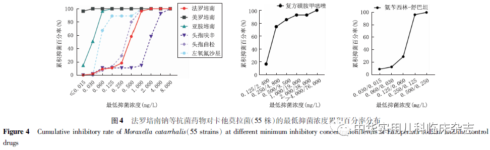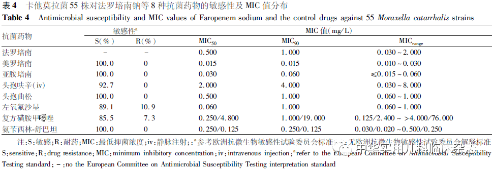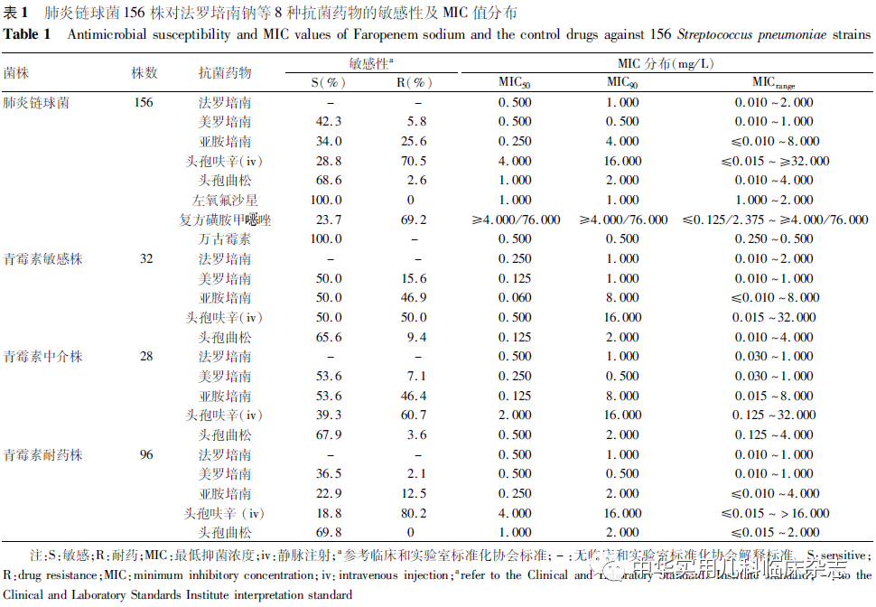法罗培南是全球首个青霉烯类口服抗菌药物,抗菌谱广,与青霉素结合蛋白(PBPs)有很好的亲和力,且不易诱导产生细菌耐药性[1-3]。法罗培南属β-内酰胺类抗菌药物,在青霉烯母核的2-位上接一个4氢呋喃基团,为青霉烯类衍生物。其与美罗培南、亚胺培南等碳青霉烯类抗菌药物不同,后者共同特征为噻唑环上的硫原子被碳原子替代。法罗培南通过阻止细菌细胞壁合成发挥抗菌作用,具有广谱抗菌活性[4-5],对金黄色葡萄球菌、流感嗜血杆菌、卡他莫拉菌、肺炎克雷伯菌、化脓性链球菌等均有较强的杀菌作用[6-7]。小儿法罗培南钠已列入医保目录,但基于国内儿科病原的小儿法罗培南钠体内外抑菌活性评估尚少见,缺少确定其临床适用范围的参考数据。本研究评估法罗培南钠对儿童常见呼吸道致病菌肺炎链球菌、流感嗜血杆菌、肺炎克雷伯菌、卡他莫拉菌的体外抗菌活性,为小儿法罗培南钠的临床研究和应用提供参考。