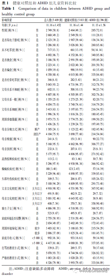 结果2.1 儿童ADHD检出情况 本次调查的5 409例儿童共检出396例ADHD,检出率为7.3%。详细资料见表1。