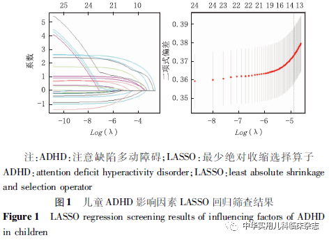 资料与方法1.1 研究对象 于2020年7月至11月采用随机整群抽样的方法调查新疆地区5所学校共5 409例7~16岁儿童,斯诺佩(SNAP)-Ⅳ评定量表由熟悉儿童的班主任或任课老师填写,ADHD影响因素调查问卷由父母填写。共发放问卷 5 500份,回收问卷 5 409份,有效问卷5 409份,有效率为98.3%。其中,男2 749例,女2 660例,年龄(11.16±1.45)岁。本研究通过石河子大学医学院学术伦理委员会批准(批准文号:2017-063-01)。ADHD组入组标准:(1)均为新疆地区儿童,年龄7~16岁;(2)性别不限;(3)经主治医师及以上的精神科医师确诊,符合《美国精神障碍诊断与统计手册》第5版(DSM-5)中ADHD诊断标准[11]。ADHD组排除标准:(1)智商(IQ)<80;(2)既往诊断有双向情感障碍、重性精神病、广泛发育障碍等疾病。共纳入396例儿童。健康对照组入组标准:(1)均为新疆地区儿童,年龄7~16岁;(2)性别不限。健康对照组排除标准:(1)IQ<80;(2)排除ADHD、既往诊断双向情感障碍、重性精神病、广泛发育障碍等疾病。共纳入5 013例儿童。1.2 调查方法1.2.1 ADHD SNAP-Ⅳ评定量表(教师版) 该量表[12]共26个条目,分为3个因子:注意力不集中(9个条目)、多动/冲动(9个条目)、对立违抗(8个条目);采用4级评分法:“完全没有=0”、“有一点=1”、“还算不少=2”、“非常多=3”。本研究将采用注意力不集中和多动/冲动2个因子进行测量评估,儿童在任意一个因子有6个及以上条目得分为2或3分并结合注意力不集中、多动/冲动的临床表现判定为ADHD可疑儿童。1.2.2 ADHD影响因素调查问卷 人口学资料包括性别、年龄、出生日期、身高、体质量;行为习惯包括体育运动、电子游戏、饮食习惯等;家庭环境包括父亲年龄、母亲年龄、母亲分娩方式、父亲文化程度、母亲文化程度、父母关系、家庭经济收入等,共29个条目。1.3 统计学处理 运用EpiData3.1软件进行资料录入,使用R4.0.2软件进行统计分析。计量资料用x̄±s表示,计数资料用例数(%)表示。采用LASSO回归筛选影响ADHD儿童患病的可能因素,将LASSO回归筛选的变量以向后的方式进行多因素的Logistic回归分析,使用受试者工作特征曲线(ROC)分析其效能。依据Logistic回归分析结果建Nomogram预测模型,采用Bootstrap重采样1 000次,对Nomogram图进行内部验证,通过校正曲线和C-index指数,评估模型的准确性和一致性。