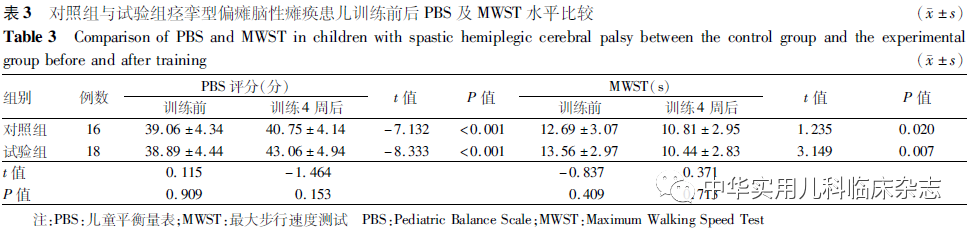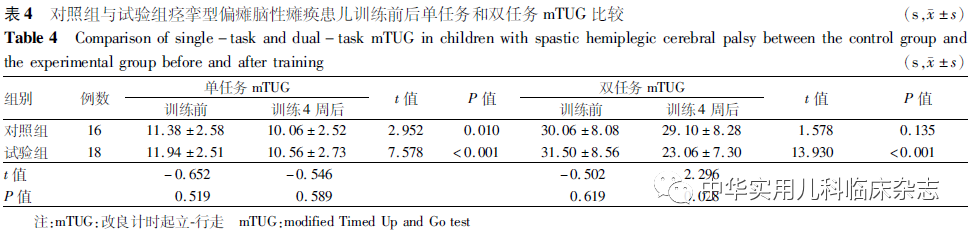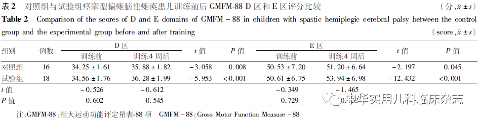 结果2.1 训练前后GMFM-88 D区和E区评分情况比较 与训练前相比,训练4周后对照组与试验组GMFM-88 D区和E区评分均显著升高,差异均有统计学意义(均 P<0.05);2组训练前后比较差异均无统计学意义(均P>0.05),见表2。