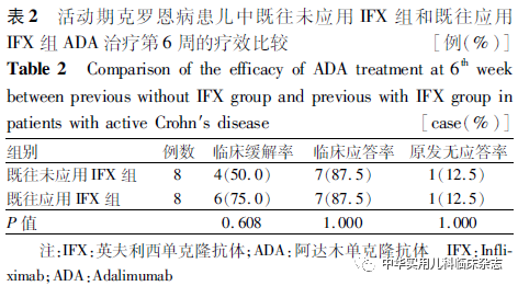 讨论儿童CD患者逐年增加,常合并营养不良、生长迟缓、肛周病变、皮肤、关节等肠外表现,本病病情进展快,手术率高,治疗难度大。研究发现,在起病前2年内采用抗TNF-α单克隆抗体治疗能显著降低CD肠狭窄、手术、肛周病变及其他并发症的发生率,因此早期生物制剂治疗可帮助改善预后[8]。国外研究报道,ADA治疗儿童CD第4周的临床应答率为50%~87%,临床缓解率为24%~61%;第12周分别为65%~91%、30%~88%[9]。意大利的多中心研究显示,使用ADA治疗IFX失应答的CD患者,第6、12、18个月的临床缓解率分别为55%、78%和52%,提示ADA可作为IFX治疗继发失应答中重度活动性CD患者的二线生物制剂[3]。本研究中CD患儿在ADA治疗第6周的临床缓解率和临床应答率分别为62.5%、87.5%,既往未应用IFX组和既往应用IFX组第6周的临床缓解率和临床应答率比较,差异均无统计学意义(均P>0.0.5)。这也证实了ADA在儿童CD患者诱导临床缓解方面具有较好的疗效,包括对于IFX治疗失应答或出现过敏反应转换为ADA治疗的CD患者。不同研究ADA的临床缓解率及临床应答率存在一定差异,分析原因考虑可能与ADA用药时机、用药前是否应用IFX、是否联合免疫抑制剂以及是否主动药物浓度监测等有关。本研究的短期临床缓解率和临床应答率偏高,可能与本组CD患儿用药时机相较其他研究更早有关,本研究CD患儿应用ADA前疾病持续时间为0.9(0.4,1.7)年,而IMAgINE1研究中的中重度活动CD患者应用ADA治疗前的病程约为3年[6]。另外本研究中既往未应用IFX组CD患者占比50.0%,较其他研究偏高(0~55.9%)[9]。本研究ADA治疗中位持续时间为5.5个月,随访过程中3例出现继发失应答,其中2例停用ADA,改IFX治疗,1例联合全肠内营养治疗,再次获得临床缓解。对于抗TNF-α单抗治疗的活动性CD患儿,共识建议根据药物浓度监测指导治疗,而不是经验性增加剂量或转换药物[10-11]。根据药物浓度监测结果,如ADA药物谷浓度在治疗窗内,建议转换其他作用机制的药物;如药物谷浓度低于治疗窗浓度,且未检测到抗药抗体或抗药抗体滴度较低,可通过增加ADA剂量或缩短注射ADA间隔时间或联用免疫抑制剂等方式优化治疗方案,使患儿重新获得应答;如药物谷浓度不足,且抗药抗体滴度较高,建议转换其他作用机制的治疗药物。ADA治疗CD维持临床缓解方面,研究显示6个月临床缓解率为28%~55%,12个月临床缓解率为23%~97%[9]。本研究随访结束时临床维持缓解率(17/20例,85.0%)较高,除与ADA用药时机较早有关,也可能与既往未应用IFX组患儿比例较高、随访时间较短、ADA联合免疫抑制剂比例(13/20例,65.0%)较高有关。成人的研究已经证实,抗TNF-α单抗联合免疫抑制剂治疗可减少抗抗体产生,提高生物制剂血药浓度,从而提高疗效[12]。但在儿童CD患者中,目前尚缺乏足够的证据确定单药或联合治疗的风险/效益比。Hyams等[13]关于ADA联合或单药治疗中重度儿童CD患者的随机对照临床研究结果显示,与单药治疗相比,联合治疗组26周、52周临床应答率和临床缓解率差异无统计学意义。英国的一项回顾性研究显示,ADA联合免疫抑制剂组缓解率较单用ADA组更高[14]。抗TNF-α单抗与硫唑嘌呤治疗可能会增加血液系统肿瘤(包括淋巴瘤)的风险[15]。因此在临床实践中,需权衡联合用药的利弊,根据具体情况及患者意愿谨慎使用。ADA治疗安全性方面,IMAgINE 2临床研究报道的ADA常见不良反应有头痛(27.0%)、上呼吸道感染(22.0%)、鼻咽炎(21.0%)、腹泻(19.0%)和机会感染(5.7%,主要为口腔和食管真菌感染),无死亡、活动性结核或恶性肿瘤发生[16]。本研究共7例发生不良反应,包括注射局部皮肤红肿1例,肺炎或上呼吸道感染6例,无恶性肿瘤及其他严重不良反应。综上,ADA在儿童CD患者的诱导和维持临床缓解方面具有较好的疗效及安全性,包括对于IFX治疗失应答或出现过敏反应转换为ADA治疗的CD患者。由于本研究为单中心研究,存在一定的局限性,样本量较小,随访时间较短,有待更多的随机、双盲、多中心大样本研究来确定ADA治疗的长期疗效和安全性。
