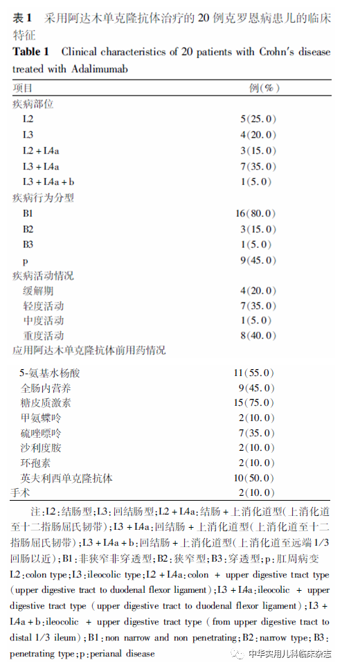 资料与方法1.1 研究对象 回顾性分析2016年9月至2021年9月在首都医科大学附属北京儿童医院诊治的20例应用ADA治疗的CD患儿。纳入标准:(1)符合2019年《儿童炎症性肠病诊断和治疗专家共识》[2]制定的CD诊断标准;(2)年龄0~18岁,应用ADA治疗≥3次。排除标准:(1)具有ADA使用禁忌证(严重感染、活动性结核、淋巴瘤或其他恶性肿瘤);(2)曾经使用过ADA治疗;(3)应用ADA治疗<3次。本研究通过首都医科大学附属北京儿童医院医学伦理委员会批准(批准文号:2022-E-038-R),并豁免知情同意。1.2 方法1.2.1 临床资料收集 收集患儿性别,起病年龄,诊断年龄,巴黎分型,儿童克罗恩病活动指数(PCDAI),克罗恩病内镜下严重指数(CDEIS),首次应用ADA年龄、ADA前用药情况、ADA用药剂量、ADA用药时长、ADA合并用药,随访时间,不良反应。1.2.2 CD疾病评估 按照巴黎分型[4],CD按病变部位分型如下:回肠末段(L1)、结肠(L2)、回结肠(L3)、上消化道型(L4a上消化道至十二指肠屈氏韧带,L4b十二指肠屈氏韧带至远端1/3回肠以近);按疾病行为分型如下:非狭窄非穿透(B1)、狭窄(B2)、穿透(B3)、狭窄穿透(B2B3)和肛周病变(p)。采用PCDAI评估疾病活动严重程度,分为临床缓解(<10.0分)、轻度活动(10.0~27.5分)、中度活动(30.0~37.5分),重度活动(≥40分)。1.2.3 CD内镜评估 采用CDEIS[5]来评估CD内镜下结肠黏膜炎症。CDEIS<3分为内镜下缓解,3~<9分为轻度活动,9~<12分为中度活动,≥12分为重度活动。1.2.4 ADA疗效判定方法 ADA治疗第6周进行临床疾病活动度评分,将PCDAI较基线下降≥15分定义为临床应答,PCDAI<10分定义为临床缓解[6]。原发性无应答是指开始抗TNF-α单抗诱导治疗后的6周内(第2-3次输注),患儿临床症状无明显改善。继发性失应答是指对抗TNF-α单抗诱导治疗有应答,在维持治疗阶段疾病复发[7]。1.3 统计学处理 采用SPSS 22.0软件进行分析。计量资料经正态性检验,若满足正态性分布,采用x̄±s进行描述,若不符合则采用中位数(P25,P75)描述;计数资料采用频数和率进行描述。非正态分布计量资料采用非参数秩和检验进行组间比较。计数资料比较采用Fisher′s确切概率法,P<0.05为差异有统计学意义。