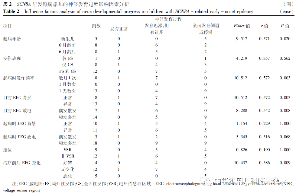 资料与方法1.1 资料收集 回顾性研究。纳入2017年1月至2021年2月广州市妇女儿童医疗中心及昆明市儿童医院诊治SCN8A早发癫痫患儿21例。21例经二代测序、Sanger一代验证,均为新发错义突变,根据美国医学遗传学与基因组学学会(ACMG)指南[6],评为可能致病或致病。收集所有患儿的起病年龄,发作形式、发作频率、起病时的神经发育情况、脑电图(EEG)、头颅磁共振成像(MRI),随访患儿起病后的药物治疗情况,发作演变或改善、EEG演变、神经发育的进程、随访终点的精神运动发育状况。本研究获得广州市妇女儿童医疗中心医学伦理委员会批准[批准文号:穗妇儿科伦通字(2020)第08100号],患儿监护人均知情同意。1.2 分组 根据癫痫发病后的神经发育过程分为:(1)发育正常;(2)发育迟滞,但有进步;(3)全面发育倒退或停滞。根据Shaffer 等[7]的定义将神经发育结局分为:(1)正常;(2)轻度[发育商(DQ)或智商(IQ)为50~70];(3)中度(DQ或IQ为35~50);(4)重度(DQ或IQ为20~35);(5)极重度(DQ或IQ<20)。根据起病年龄分为:(1)新生儿起病;(2)6个月前起病;(3)6个月后起病。根据发作形式按照2017年ILAE癫痫发作指南[8]分为:(1)仅有局灶性发作;(2)仅有全面性发作;(3)既有全面又有局灶性发作。根据发作频率分为:(1)数月1次;(2)1个月数次;(3)1天数次。EEG背景分为:(1)背景正常;(2)背景慢(含高度失律)。EEG痫样异常分为:(1)偶发(1 h 1~2次放电)或散发(单个出现)放电;(2)频发(每分钟均有放电)或持续多灶或弥漫性放电(含高度失律)。根据EEG临床症状等综合分析,确定电临床综合征[8-9]分为:(1)EIEE;(2)非脑病的癫痫,(3)婴儿良性癫痫(BIE)。治疗反应:(1)有效:经过合理的药物治疗,随访期内(或3倍于以往发作的最长时间间隔)能够控制发作,包括发作控制后因药物剂量不足再次偶发的情况;(2)难治:经过抗癫痫发作药物(ASMs)多药联合治疗(均尝试用过最大剂量的钠离子通道阻滞剂,用丙戊酸的患儿均达到有效药物浓度高限),仍每月发作4次以上。突变位点分布(根据 Holland等[10]的方法)分为:(1)电压传感器区域(VSR);(2)非VSR区。EEG变化根据起病时及末次随访期间的EEG对比分为:(1)好转:背景由异常转为正常,放电由频发转为偶发甚至未检出;(2)无变化:背景及痫样异常的程度同起病时;(3)恶化:背景由正常转为异常,放电由偶发散发转为频发。1.3 统计学处理 应用SPSS 19.0软件分析数据。采用Fisher′s 精确检验确定各个影响因素与神经发育的相关性。P<0.05为差异有统计学意义。