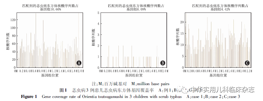 结果例1外周血mNGS检测结果为恙虫病东方体感染,严格匹配核酸序列数为1 725条(表1),基因覆盖率为10.60%(图1A),结果回报前患儿因多脏器衰竭死亡。例2外周血mNGS检测结果为恙虫病东方体感染,严格匹配核酸序列数为10条(表1),基因覆盖率为0.09%(图1B),先后给予阿奇霉素、氯霉素抗感染后,患儿临床症状逐渐好转,最终治愈出院。例3外周血mNGS检测结果为恙虫病东方体感染,严格匹配核酸序列数为1 925条(表1),基因覆盖率为4.42%(图1C),先后给予阿奇霉素、氯霉素抗感染后,患儿临床症状逐渐好转,最终治愈出院。