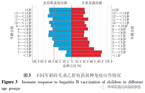 讨论HBV感染呈世界性流行,全球每年约88.7万人死于HBV感染相关疾病。在我国实施新生儿乙肝疫苗免疫规划前,HBV以母婴传播为主,占30%~50%[3]。但随着1992年我国在新生儿中推广使用乙肝疫苗,尤其2002年将乙型肝炎纳入儿童免疫规划后,乙肝疫苗的全程接种率显著提高,大大减少了因母婴传播而导致的HBV感染[3]。我国2014年开展的全国病毒性肝炎血清流行病学调查显示,1~4岁儿童的乙肝表面抗原(HBsAg)携带率为0.3%,5~14岁为0.9%,与乙肝疫苗接种前相比,我国1~15岁儿童HBsAg阳性率降低90%,提示我国通过新生儿乙肝疫苗免疫阻断母婴传播为主的预防策略取得了巨大成效[4],接种乙肝疫苗是预防HBV感染最有效的方法。且对比成人,儿童的免疫功能发育尚不完善,自身抵御病毒的能力弱,相关疾病诊断和治疗显得困难,再次凸显疫苗接种的重要性[5]。但现有方案仍存在一些不足之处,即便是规范接受全程疫苗接种的人群中,仍有5%~10%不产生 Anti-HBs 或产生的Anti-HBs滴度<10 IU/L,呈无应答状态[6]。同时存在随年龄增长,抗体滴度逐年下降的现实。Anti-HBs作为一种保护性抗体,在接种疫苗后获得的免疫记忆持久性,是判断是否需要进行加强免疫及何时进行加强免疫的主要依据。目前关于我国儿童低应答现状的调查报道较少。本研究从定量研究角度出发,结果发现:<1岁儿童 Anti-HBs有效应答的阳性率为92.5%,1~<2岁达98.9%,呈升高趋势,2岁后逐渐下降。<1岁组的阳性率不及稍大儿童,这是因为新生儿和婴儿中存在胎传抗体,体内T、B淋巴细胞记忆应答相对较弱,从而使其获得性免疫力不及稍年长儿童。但随着年龄增长,儿童Anti-HBs滴度呈逐渐下降的趋势。研究表明,乙肝疫苗无或低应答是多种因素综合作用的结果,主要与疫苗因素、机体自身特征及环境特征、免疫相关遗传因素及分子特征等方面相关[7-10]。无应答和低应答群体仍被认为是HBV易感者。1997年,Clemens等[11]研究表明,Anti-HBs滴度>100 IU/L的人群才能获得更永久的免疫保护[11]。Mendy等[12]表示,Anti-HBs滴度不低于 100 IU/L时才具有抵抗HBV入侵的作用。Cocchio等[13]学者在对接种乙肝疫苗的医护人员的追踪调查中表示,抗体滴度高于100 IU/L的医护工作者,在医疗环境中才能获得更好的保护效应[13]。本研究发现,在0~14岁儿童中,无应答占比20.7%,低应答占31.3%。对于Anti-HBs滴度在10~100 IU/L的低应答儿童,及时进行加强免疫复种同样是十分必要和迫切的,通过增加乙肝疫苗的免疫次数或接种剂量,可使无或低应答者产生保护性抗体[14-15],但什么时候开始加强免疫尚缺乏客观研究依据。有学者建议,对于无应答的儿童,尽早再次补接种,而低免疫应答的儿童,建议在半年内再次接种乙肝疫苗[16]。本研究结果显示,从3岁开始的各个年龄组,Anti-HBs滴度<100 IU/L(处于无应答和低应答状态)的占比几乎均超过50.0%,相应组别Anti-HBs中位数均<100 IU/L,因此作者认为在3岁这个节点进行干预具有重大社会意义,对3岁以上儿童群体开展乙肝疫苗的复种计划也显得十分必要。综上,即便我国尚未对乙肝疫苗复种计划和复种年龄有足够明确的定论,但为有效防治乙肝,本课题组建议可在当地对3岁儿童开展乙肝疫苗的复种计划,全社会也应重视对3岁及以上的儿童乙肝血清学免疫标志物的监测,从而更好地巩固乙肝疫苗的免疫保护功效,增强各年龄段儿童对乙肝疫苗的应答水平。本研究缺乏对受试者母亲HBV携带情况的调查,以及后期缺乏对乙肝疫苗无或低免疫应答儿童是否补接种的追踪调查,这是本研究的不足之处,相信今后的研究设计将更加严谨,记载资料收集也将会更加详细与精准。