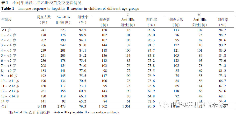 乙型肝炎病毒(hepatitis B virus,HBV)感染是全球性的公共卫生问题,乙肝疫苗免疫接种是预防和控制传染病最经济、简便和有效的手段”[1-2]。而HBV感染的结局与感染年龄高度相关,感染HBV年龄越小,越易形成慢性肝炎。2002年以来,我国实施新生儿免费接种乙肝疫苗,乙肝疫苗全程需接种3针,按照0、1和6个月的程序[1]。在实施这一防控策略后,我国HBV感染防控虽取得一定成效,但随着年龄增长,乙肝疫苗所产生的乙肝表面抗体(Anti-HBs)滴度会逐渐下降,保护作用逐渐减弱,因此,对于无Anti-HBs和低滴度Anti-HBs的儿童进行强化免疫可能是必要的。为了解杭州市儿童乙肝免疫现况,本研究调查在杭州师范大学附属医院进行乙肝相关抗原抗体血清学定量检查的0~14岁儿童,希望能对儿童乙肝疫苗强化免疫的干预年龄提供客观依据。