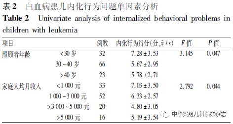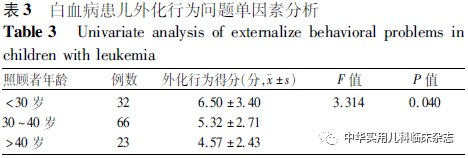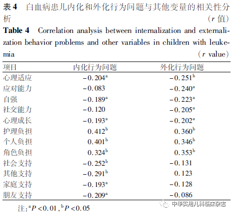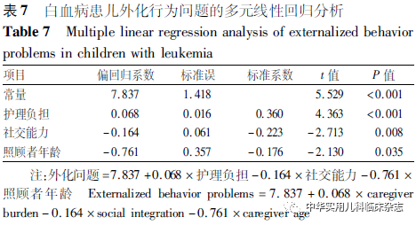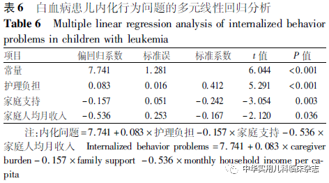讨论本研究结果显示,白血病患儿内化行为问题得分为(6.12±3.13)分,外化行为问题得分为(5.49±2.92)分,明显高于黄鹤和王小英[9]对学前儿童行为问题的调查结果。这提示白血病患儿较健康儿童存在更明显的内化和外化行为问题,与Firoozi和Rouhi[15]的研究结果一致。分析可能原因为,白血病患儿因治疗而影响社会生活、学校学习等,增加了患儿成长过程中的痛苦。本研究中,患儿情绪症状和同伴交往问题得分明显高于寇建华等[8]对2 148例儿童情绪行为的调查结果。分析可能原因为,诊断后的长时间治疗、频繁住院和因治疗引起身体变化等原因导致白血病患儿的同伴关系受到影响。Kuntz等[16]的研究指出,患癌症的儿童经常感受到来自同龄人的孤立。Tsimicalis等[17]的研究也发现,由于癌症治疗带来的身体变化(如脱发、体质较差)等原因,癌症患儿无法融入同龄人圈子,导致存在交往障碍。同时对白血病患儿同伴关系产生负面影响的经历也会对其心理产生影响[18],导致其出现更多的情绪症状。因此,临床医护人员和照顾者应关注患儿的内化与外化行为问题,及时准确地发现患儿的不良情绪,帮助其寻求合适的同伴支持,减轻问题行为的发生率。本研究结果显示,照顾者年龄<30岁的白血病患儿内化和外化行为问题得分更高,与Levine等[19]的研究结果一致。他们的研究发现,年轻母亲的孩子更易出现行为问题[19],可能与年轻母亲敏感度不够,对儿童缺乏照顾,更易做出危害儿童的行为有关[20]。此外,本研究还发现人均月收入<1 000的家庭,白血病患儿更易出现内化行为问题,与刘海霞[21]的研究结果一致。家庭收入水平较低,无法给患儿提供较好的资源和社会支持,导致患儿心理压力较大,情绪问题更明显。Navarro等[22]的研究结果也证实了社会经济地位较低的家庭,患儿更易出现情绪控制障碍和交友困难等问题。本研究发现,照顾者护理负担与白血病患儿内化和外化问题呈正相关,且护理负担是内化和外化行为问题的主要预测因子,与Yorke等[23]的研究结果一致。Yorke等[23]的研究发现,照顾者的高度心理压力与自闭症患儿早期的情绪和行为问题密切相关,父母高度的心理不适可增加儿童情绪和行为问题。护理负担较重的照顾者面对疾病的诊断更易出现负性情绪,如焦虑抑郁等,这种情绪反馈给患儿更易导致其出现不良行为。Wlodarczyk等[24]的研究也表明父母的心理健康问题增加了儿童发生心理障碍的可能性。这提示临床医护人员需要关注照顾者的心理问题,及时发现其不良情绪,通过减轻护理负担的方式来缓解患儿及照顾者的心理压力,帮助减轻患儿情绪行为问题。本研究结果显示,家庭支持是白血病患儿内化行为问题的预测因素。即家庭支持可以降低患儿内化行为问题的发生风险,与Chang等[25]的研究结果一致。Sonego 等[26]的研究结果也证实了患儿家庭功能与其情绪和行为问题有关。分析其原因可能是因为家庭支持有助于帮助建立良好的亲子关系,良好的亲子关系可促进患儿和照顾者交流,照顾者更加重视患儿的情感需求,从而减少患儿问题行为的发生。综上,白血病患儿的内化和外化行为问题较为严重,照顾者护理负担、家庭关系和家庭人均月收入是患儿内化行为问题的影响因素,照顾者护理负担、社交能力和照顾者年龄是患儿外化行为问题的预测因素。这提示,应充分重视白血病患儿的不良情绪问题,着重关注照顾者年龄较小,家庭人均月收入较低的患儿。通过减少照顾者护理负担,改善家庭和社会关系的方法来减轻患儿的不良情绪问题。本研究也有一定局限性,首先本研究为横断面调查研究,无法准确反映变量间的因果关系。其次本研究调查问卷均由患儿照顾者填写,可能存在主观偏移,无法准确反映患儿情绪行为问题,今后将在不同患儿群体进一步开展多中心、大样本的纵向研究,明确不同疾病治疗阶段白血病患儿内化和外化问题的影响因素。