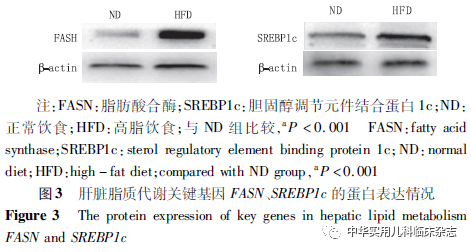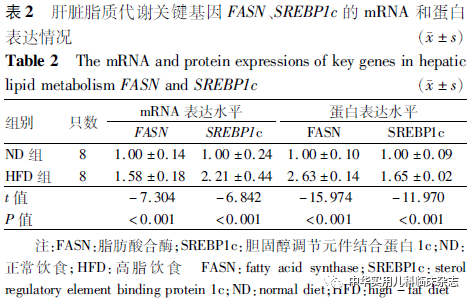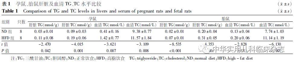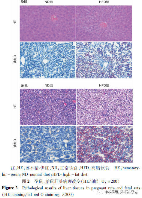 材料与方法1.1 实验动物及试剂 8周龄清洁级SD大鼠,雌性16只,雄性8只,购于北京维通利华实验动物技术有限公司,动物许可证号:SCXK(京)2016-0006。饲养于实验动物中心无特殊病原体(SPF)实验室,予12 h/12 h昼夜光照,温度20~26 ℃,湿度40%~70%,自由饮水,采用随机数字表法将实验动物分组,并给予相应饮食。60%高脂饲料(江苏美迪森生物科技有限公司);三酰甘油(TG)、胆固醇(TC)试剂盒(南京建成生物工程研究所);RNA提取试剂盒、反转录试剂盒、PCR SYBR Green试剂、β-actin抗体、山羊抗兔二抗(上海翌圣生物科技股份有限公司);40 g/L多聚甲醛、放射性免疫沉淀分析(RIPA)裂解液、二喹啉甲酸(BCA)蛋白浓度测定试剂盒、蛋白上样缓冲液、增强化学发光(ECL)曝光液(武汉博士德生物工程有限公司);脂肪酸合酶(FASN)抗体(美国CST公司);胆固醇调节元件结合蛋白1c(SREBP1c)抗体(武汉爱博泰克生物科技有限公司)。本研究已通过华中科技大学同济医学院附属同济医院伦理委员会的批准(批准文号:TJ-A20190801),实验过程中所有操作遵守伦理委员会发布的伦理及管理指南。1.2 妊娠期肥胖动物模型的建立 健康8周龄SD大鼠适应性喂养1周后,按雌雄2∶1合笼,次晨阴道涂片验孕,显微镜观察到精子视为孕0.5 d。受孕成功后,孕鼠立即按随机数字表法分为2组:正常饮食(ND)组和高脂饮食(HFD)组,每组8只。ND组给予正常饲料,HFD组给予60%高脂饲料,孕鼠每周监测体质量。孕21.5 d孕鼠禁食12 h,100 g/L水合氯醛麻醉后行剖宫产手术,记录胎鼠出生体质量。留取孕鼠、雄性胎鼠血清及肝脏组织。孕鼠剖宫产术后暴露心脏取血,胎鼠断头取血。部分肝脏组织固定在40 g/L多聚甲醛,留待组织切片;部分肝脏组织液氮速冻后,保存于-80 ℃冰箱,用于后续实验。1.3 肝脏HE染色 新鲜的肝脏组织在40 g/L多聚甲醛中固定24 h,石蜡包埋后切片。石蜡切片脱蜡水化,HE染色,中性树胶封片,光学显微镜下观察。1.4 肝脏油红O染色 肝脏冷冻切片干燥复温10 min,600 g/L异丙醇漂洗15 s,油红O染色,中性树胶封片,光学显微镜下观察。1.5 肝脏、血清TG、TC水平检测 肝脏组织样本研磨后提取上清用于检测。在96孔板设置标准孔、样本孔和空白孔,依次加入2.5 μL的标准品、蒸馏水、肝脏提取液或血清样本,后迅速加入250 μL工作液,混匀,37 ℃”孵育10 min,波长510 nm,酶标仪测定各孔A值,根据说明书,计算肝脏、血清的TG、TC水平。1.6 实时荧光定量PCR(RT-PCR) 使用Primer Premier 6和Oligo 7进行引物设计和验证,交由擎科生物科技有限公司合成。FASN正向引物:5′-GCTGCTACAAACAGGACCATC-3′,反向引物:5′-TCCACTGACTC-TTCACAGACCA-3′;SREBP1c正向引物:5′-AGACAAACT-GCCCATCCACC-3′,反向引物:5′-AAGCGGATGTAGT-CGATGGC-3′;β-actin正向引物:5′-GGAGATTACTGCCCTGGCTCCT-3′,反向引物:5′-GACTCATCGTACTCCTGCTTGCT-3′。利用RNA提取试剂盒提取肝脏组织RNA,分光光度计检测RNA浓度及纯度。根据反转录试剂盒说明,冰上配制反转录反应体系。反转录仪将RNA反转录为互补脱氧核糖核酸(cDNA)后,冰上配制PCR反应体系:PCR SYBR Green 5 μL,上下游引物各0.2 μL,cDNA 1 μL,双蒸水(ddH2O) 3.6 μL;PCR反应条件:95 ℃预变性2 min,95 ℃变性10 s,60 ℃退火/延伸30 s,40个循环。根据得到的Ct值,利用2”-△△Ct计算分析,得到相对定量的结果。1.7 Western blot检测 采用RIPA裂解液提取组织蛋白,BCA蛋白浓度测定试剂盒测定蛋白浓度。制备分离胶和浓缩胶,按30 μg蛋白上样量进行十二烷基硫酸钠-聚丙烯酰胺凝胶电泳(SDS-PAGE),后转膜至聚偏二氟乙烯(PVDF)膜上。50 g/L脱脂牛奶室温封闭60 min。稀释后的一抗(均1∶1 000稀释)4 ℃孵育过夜,洗膜缓冲液(TBST)洗膜3次,稀释后的二抗(1∶5 000稀释)室温孵育60 min,TBST洗膜3次。ECL曝光液在凝胶成像分析仪中曝光显影,Image Lab软件分析目的蛋白和内参的灰度值。1.8 统计学处理 采用SPSS 19.0统计软件进行统计分析,计量资料正态分布以x̄±s表示,两组数据间比较采用独立样本t检验。P<0.05为差异有统计学意义。