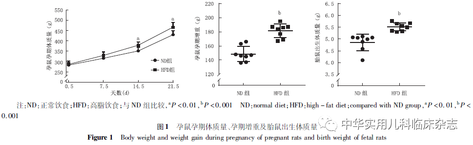 结果2.1 EGWG大鼠模型构建 HFD组与ND组孕鼠孕前体质量无差异;孕14.5 d开始,HFD组孕鼠体质量[(379.38±16.74) g]较ND组[(351.50±18.38) g]明显增加,差异有统计学意义(t=-3.171,P<0.05);至孕21.5 d,HFD组孕鼠体质量[(467.75±22.05) g比(430.88±18.80) g,t=-3.600,P=0.003]、孕期增重[(181.50±9.68) g比(148.50±10.86) g,t=-6.415,P<0.001]、胎鼠体质量[(5.51±0.17) g比(4.85±0.35) g,t=-4.779,P<0.001]均较ND组显著增加(图1)。提示孕期21 d高脂饮食可成功构建EGWG大鼠模型。