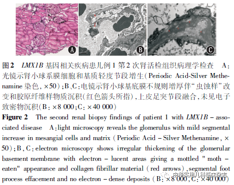 结果例1,女,11岁,汉族。因蛋白尿伴镜下血尿9年就诊。患儿病初因手足口病住院,发现蛋白尿伴镜下血尿,无肉眼血尿、尿少和高血压。入院前4年因多次尿常规检查示蛋白2+~3+、红细胞6~42个/高倍视野(HP),24 h尿蛋白定量0.935 g,遂于外院行肾活检,光镜示系膜增生性肾小球病;电镜示肾小球系膜细胞和基质轻度增生,节段中度加重,肾小球基底膜节段变薄,上皮足突节段融合,未见电子致密物沉积;病理诊断为系膜增生性肾小球病。予以口服中成药治疗,蛋白尿和镜下血尿无改善,监测血肌酐正常。家族史(图1A):患儿父母非近亲结婚。其母有慢性肾炎病史9年,不伴指甲、四肢和关节异常,46岁时于北京大学第一医院行相关实验室检查示肾小球性血尿伴肾病水平蛋白尿(尿蛋白肌酐比值为2.2 g/g),肾功能正常,眼部检查和纯音测听检查均正常;姐姐24岁时无指甲、四肢和关节异常,于北京大学第一医院行相关实验室检查示肾小球性血尿伴微量白蛋白尿(尿微量白蛋白肌酐比值为60.72 mg/g,尿蛋白肌酐比值为0.13 g/g),肾功能正常,眼部检查和纯音测听检查均正常;外祖母58岁死于“脑梗死”,父亲和外祖父否认肾脏病史。为明确诊断收住院。入院体格检查未发现指甲、四肢和关节异常,监测血压正常。实验室检查:尿常规示蛋白3+、红细胞12~30个/HP,尿有形成分分析示肾性血尿(环状红细胞20%、穿孔红细胞30%),尿蛋白定量为2.96 g/24 h[90 mg/(kg·24 h)],尿白蛋白肌酐比值为3 731.58 mg/g(参考范围<30 mg/g),血白蛋白30 g/L、胆固醇5.75 mmol/L、血肌酐39.79 μmol/L,矫正 24 h 内生肌酐清除率为190 mL/(min·1.73 m2)。血乙型肝炎病毒标志物、多种自身抗体、补体C3和C4均正常。泌尿系超声示肾脏大小正常。眼部检查和纯音测听检查均正常。肾活检病理检查:光镜示肾小球轻微病变伴部分肾小球硬化(图2A);未行常规免疫荧光染色;电镜示肾小球基底膜不规则增厚伴“虫蚀样”改变和胶原纤维样物质沉积,上皮足突节段融合,未见电子致密物沉积(图2B、2C)。皮肤组织和肾活检组织 Ⅳ 型胶原a5链免疫荧光染色均正常。经患儿父母知情同意后分别提取患儿、母亲及姐姐外周血DNA,采用目标序列靶向捕获测序技术进行LMX1B基因和Alport综合征致病基因检测分析,异常结果经Sanger测序验证。患儿检出LMX1B基因(NM_001174146.1)外显子4杂合错义变异:c.737G>A(p.Arg246Gln)(图3A),未检测到Alport综合征致病基因变异。其母亲和姐姐亦均检测到该变异(图3A)。已有该变异导致LMX1B 相关肾病的报道。根据美国医学遗传学与基因组学学会(ACMG)遗传变异分类标准指南,变异c.737G>A(p.Arg246Gln)为可能致病的,结合患儿临床表现、蛋白尿伴血尿阳性家族史以及变异位点家系共分离分析结果将其解读为临床致病的。ClinVar数据库评价该变异为致病的。诊断该患儿为LMX1B相关疾病。给予培哚普利每日4 mg口服,治疗4个月和9个月后体格检查依然未发现指甲、四肢和关节异常,复查24 h尿蛋白定量分别为3.18 g和3.354 g,肾功能正常。