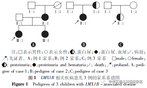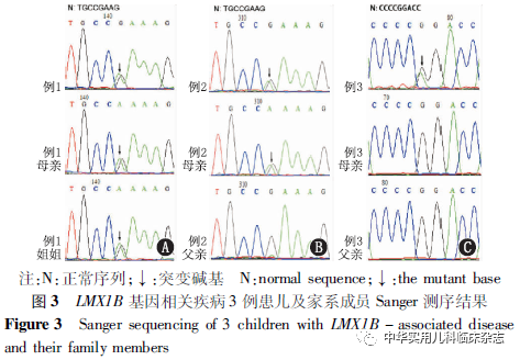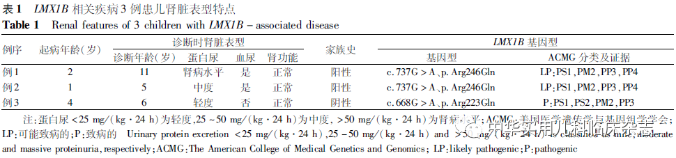 资料与方法1.1 研究对象 回顾性分析2014年4月至2017年10月在北京大学第一医院儿科诊断为LMX1B基因相关疾病的3例住院患儿。患儿以无症状蛋白尿为突出表现;来自3个无亲缘关系家庭,均因感染就诊发现肾小球性蛋白尿,考虑系基因突变所致可能性大而行目标区域捕获二代测序检测分析和Sanger测序验证(深圳华大临床检验中心),进而明确诊断为LMX1B基因相关疾病。基因检测均征得研究对象监护人知情同意,本研究通过北京大学第一医院医学伦理委员会批准[批准文号:2016(1029)]。1.2 研究方法 回顾性分析所纳入的研究对象的临床资料,包括肾脏和肾外表现、肾活检病理结果和家族史。