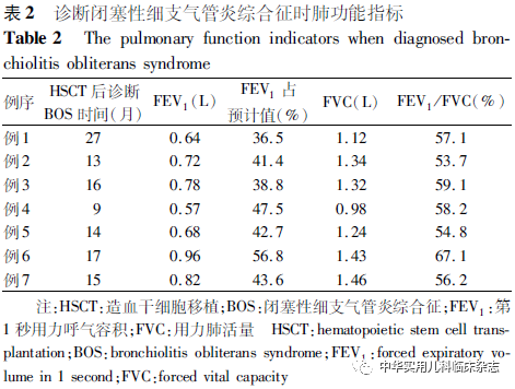 造血干细胞移植(HSCT)是治疗儿童恶性血液肿瘤及骨髓衰竭等疾病的重要方法,闭塞性细支气管炎综合征(BOS)是HSCT后肺部的慢性移植物抗宿主病(chronic graft versus host disease,cGVHD),其发病机制为供者免疫细胞攻击受者小气道并最终纤维化引起阻塞性通气功能障碍[1-2]。本病起病隐匿,预后差,严重影响患者的生存时间和生活质量。为探讨HSCT后儿童BOS的临床特点,本研究对郑州大学第一附属医院行HSCT后诊断为BOS的7例患儿临床资料进行分析,以更好地了解儿童BOS的临床特点。
