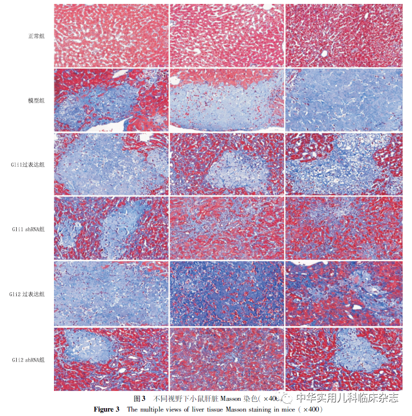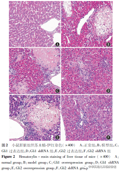 材料与方法1.1 材料 BALB/c小鼠,5周龄,购自成都达硕实验动物有限公司[生产许可证号:SCXK(川)2015-030];MA104细胞,购自武汉大学中国典型培养物保藏中心;病毒:ATCC RRV MU 10086;转轮式切片机(德国徕卡仪器有限公司);TSJ-Ⅱ 型全自动封闭式组织脱水机 PHY-Ⅲ 型病理组织漂烘仪(常州市中威电子仪器有限公司);BMJ-Ⅲ 型包埋机(常州市郊区中威电子仪器厂);数码三目摄像显微镜(BA400Digital,麦克奥迪实业集团有限公司);图像分析软件Image-Pro Plus 6.0(美国Media Cybernetics公司)。1.2 方法 1.2.1 RRV胆道闭锁幼鼠模型的建立 无特定病原体级BALB/c小鼠32只,按照雌雄比例3∶1合笼,待雌鼠产仔后,取新生1 d龄乳鼠随机(随机数法)分为2组,实验组腹腔注射轮状病毒液100 μL[病毒TCID50(50%组织细胞感染量):TCID50=10-7.64/0.2 mL]。正常组腹腔注射等量的病毒维持液。观察病毒注射后正常组与实验组小鼠变化,胆道闭锁评价标准[17]:体质量增长缓慢,黄疸,小便深黄,陶土样大便。1.2.2 分组与构造 通过RRV构建胆道闭锁模型小鼠,根据RNA干扰技术对Shh信号通路关键转录因子Gli1/Gli2表达调控的不同,将实验小鼠分为正常组、模型组、Gli1过表达组、Gli1 shRNA组、Gli2过表达组、Gli2 shRNA组。正常组,即普通BALB/c小鼠腹腔注射9 g/L盐水,模型组即胆道闭锁模型鼠腹腔注射等量病毒维持液,Gli1 shRNA组应用Gli1 shRNA沉默模型鼠Gli1基因,Gli2 shRNA组应用Gli2 shRNA沉默模型鼠Gli2基因,Gli1过表达组应用Gli1腺病毒过表达模型鼠Gli1基因,Gli2过表达组应用Gli2腺病毒过表达模型鼠Gli2基因。应用实时荧光定量聚合酶链反应及蛋白质印迹法检测实验小鼠肝组织中EMT关键调控因子Snail/Slug及EMT特征性细胞因子波形蛋白(Vimentin)、平滑肌肌动蛋白(α-SMA)、钙黏蛋白(E-cadherin)mRNA及蛋白的表达,对肝组织分别行苏木精-伊红染色(HE)染色和Masson染色观察记录肝纤维组织表达面积百分比。1.2.3 过表达Gli1/Gli2基因对RRV胆道闭锁模型小鼠胆道发育及肝脏EMT的调控作用1.2.3.1 构建过表达Gli1/Gli2基因的腺病毒载体及病毒制备 反转录聚合酶链反应扩增小鼠Gli1/Gli2基因的cDNA序列,测序正确后插入到腺病毒载体pAd-Track-CMV,与穿梭质粒Ad-easy1共转染BJ5183重组菌,挑取重组阳性克隆菌DH5α扩增后,进行高纯度无内毒素抽提,转染293T细胞,制备腺病毒。通过超离心的方法浓缩病毒。1.2.3.2 小鼠体内病毒注射 胆道闭锁模型小鼠随机(随机数法)分为2组,于注射RRV第14天用200 μL含腺病毒的磷酸缓冲盐溶液(PBS)瞬间经尾静脉注射,以含空病毒为对照组,每组实验均重复3次。1.2.3.3 Snail/Slug基因及EMT特征性细胞因子的表达 注射慢病毒7 d后(即注射RRV第21天),各组小鼠断颈处死,取肝组织,进行实时荧光定量聚合酶链反应、蛋白质印迹,在mRNA和蛋白水平分别检测Snail/Slug基因及EMT特征性细胞因子的表达改变。1.2.3.4 肝脏纤维化程度检测 取小鼠肝脏同一部位肝组织100 g/L甲醛固定后石蜡包埋,常规切片,分别行HE染色及Masson染色观察肝脏组织学改变及胶原纤维分布,根据我国肝纤维化分期标准[18],应用病理图像分析系统定量检测肝胶原纤维的面积、周长、平均光密度、积分光密度和平均灰度,以及采用酸水解法测定同一部位肝组织羟脯氨酸含量综合评估肝纤维化的程度。1.2.4 siRNA沉默Gli1/Gli2基因表达对RRV胆道闭锁小鼠胆道发育及肝脏EMT的调控作用1.2.4.1 慢病毒载体的制备 应用计算机软件设计、合成小鼠Gli1、Gli2基因shRNA寡核苷酸片段,将其插入构建慢病毒干扰质粒载体、慢病毒穿梭质粒、辅助包装原件载体质粒等三种质粒载体并分别进行高纯度无内毒素抽提,共转染293T细胞,转染后6 h更换为完全培养基,培养48 h,收集富含慢病毒颗粒的细胞上清液,通过超离心的方法浓缩病毒并收集,保存于-70 ℃冰箱备用。1.2.4.2 小鼠体内病毒注射 RRV胆道闭锁模型小鼠随机(随机数法)分为2组,于注射RRV第14天时,用200 μL含重组慢病毒的PBS瞬间经尾静脉注射,以含非特异性shRNA慢病毒为对照组,每组实验均重复3次。1.2.4.3 Snail/Slug基因及EMT特征性细胞因子的表达 方法同1.2.3.3。1.2.4.4 肝脏纤维化程度检测 方法同1.2.3.4。1.2.5 图像采集 采用麦克奥迪实业集团有限公司生产的BA200Digital数码三目摄像显微摄像系统显微摄像系统对切片进行图像采集,每张切片先于100倍下观察全部组织,再于400倍下采集图像。1.3 统计学处理 采用Image-Pro Plus 6.0图像分析系统测定所采集全部图像的光密度和面积,计算纤维组织表达面积百分比。应用SPSS 26.0软件进行统计学分析,计量资料用x̄±s表示,采用单因素方差分析和LSD-t检验对数据进行统计分析,P<0.05为差异有统计学意义。