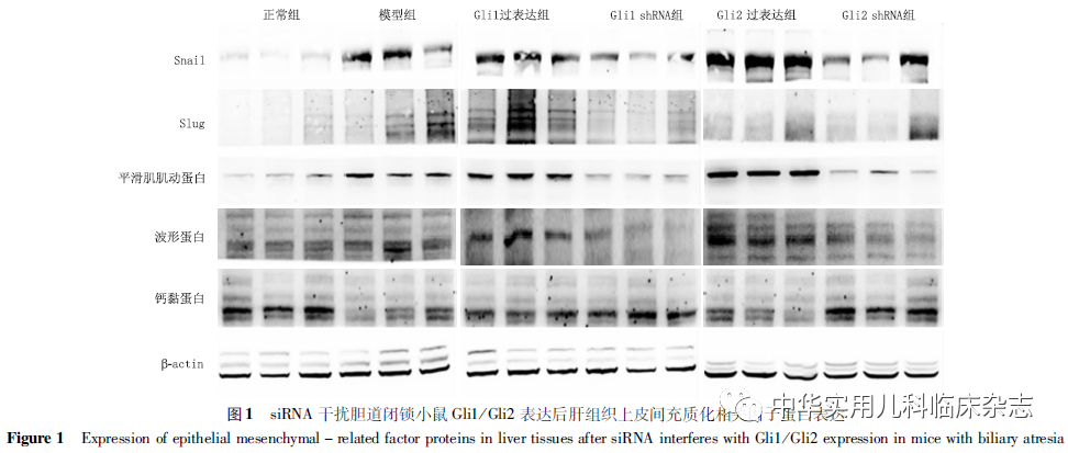 结果2.1 Shh信号通路对胆道闭锁小鼠EMT转录因子及其特征细胞因子表达的调控2.1.1 EMT转录因子Snail/Slug及其特征细胞因子E-cadherin、Vimentin、α-SMA的mRNA表达 Gli2过表达组、Gli2 shRNA组及模型组Snail、Slug、Vimentin、α-SMA、E-cadherin的mRNA相对表达量分别为 15.13±3.40、5.48±0.46、8.78±1.06、12.40±2.18 和3.06±0.53;3.73±1.16、5.62±1.75、3.56±1.06、3.88±1.16和10.51±1.83;8.13±1.27、5.32±0.98、5.05±0.98、4.02±0.77和5.12±1.60。与模型组相比,Gli2过表达组Snail、Vimentin、α-SMA的mRNA表达明显升高,E-cadherin的mRNA表达明显降低,差异均有统计学意义(t=4.53、5.29、8.12、-2.13,均P<0.05);与模型组相比,Gli2 shRNA组Snail、Vimentin的mRNA表达明显降低,E-cadherin的mRNA表达明显升高,差异均有统计学意义(t=-2.86、-2.12、5.62,均P<0.05);Gli1过表达组及Gli1 shRNA组未见明确Snail/Slug及EMT相关因子表达变化趋势。2.1.2 EMT转录因子Snail/Slug及其特征细胞因子E-cadherin、Vimentin、α-SMA的蛋白表达 Gli2过表达组、Gli2 shRNA组及模型组Snail、Slug、Vimentin、α-SMA、E-cadherin 蛋白灰度比值分别为2.02±0.39、0.31±0.08、0.95±0.17、1.07±0.17和0.42±0.06;0.53±0.13、0.40±0.18、0.20±0.04、0.28±0.07和1.09±0.31;0.70±0.15、0.42±0.22、0.64±0.13、0.81±0.11和0.42±0.09。与模型组相比,Gli2过表达组Snail、Vimentin、α-SMA表达明显升高,差异均有统计学意义(t=12.71、4.28、3.70,均P<0.05);与模型组相比,Gli2 shRNA组Vimentin、α-SMA表达明显降低,E-cadherin 表达明显升高,差异均有统计学意义(t=-6.14、-7.57、5.96,均P<0.05)(图1)。