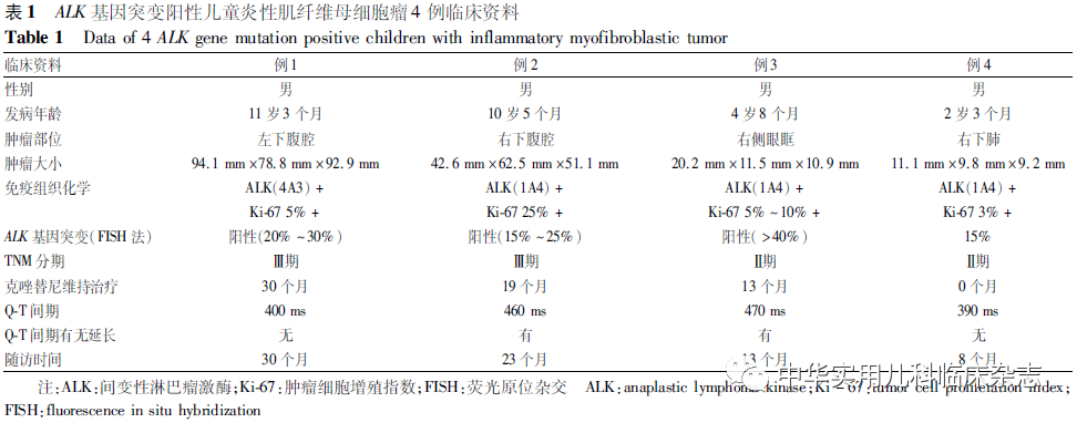 炎性肌纤维母细胞瘤(inflammatory myofibroblastic tumor,IMT)是一种间叶源性肿瘤,常发生于儿童和青壮年,发病率较低,美国每年有新发患者约200例,肿瘤最常见于肺、腹部或盆腔,大部分IMT存在ALK基因变异[1]。我国IMT发病率无确切数据,多为散发报道[2-3]。手术是治疗IMT的主要手段,然而对于不能切除的患者,治疗选择是有限的。2005年发现克唑替尼是ALK的强效抑制剂,具有良好抗肿瘤作用。2010年美国有报道称1例RANBP2-ALK融合基因阳性的IMT患者对克唑替尼反应良好,而ALK阴性的IMT患者则对克唑替尼无反应[4]。2011年8月克唑替尼获美国食品药品监督管理局批准在美国上市,用于靶向治疗EML4-ALK融合基因阳性的晚期或转移性非小细胞肺癌患者,2013年1月获中国食品药品监督局批准在中国上市,治疗ALK阳性晚期非小细胞肺癌,随后见于间变大细胞淋巴瘤和IMT的应用报道[5]。克唑替尼常见不良反应有水肿,关节间歇性疼痛,视力障碍,低钙、低磷血症,白细胞减少,贫血和Q-T间期延长等。美国儿童肿瘤组织(COG)报道应用克唑替尼治疗儿童IMT效果可观,中位年龄约为7岁[1],但全球范围应用于儿童仍较少,为探讨克唑替尼靶向治疗儿童ALK基因突变阳性IMT的有效性和安全性,本研究对4例ALK基因突变阳性IMT儿童病例进行分析。