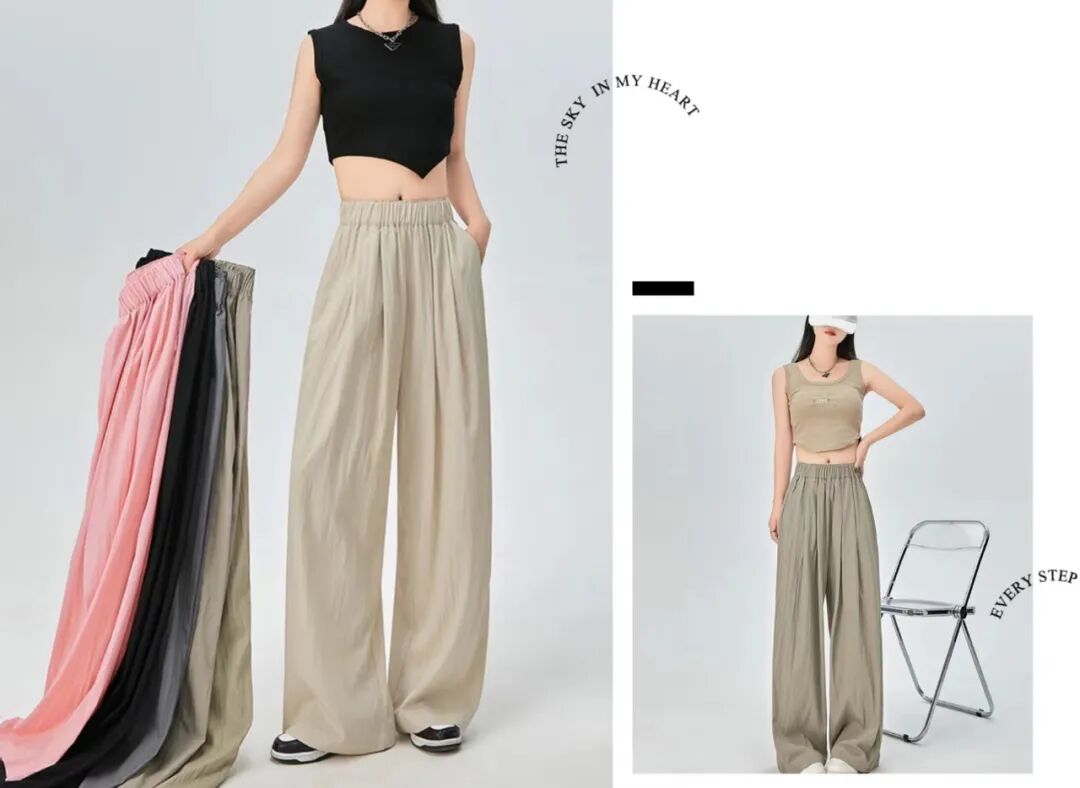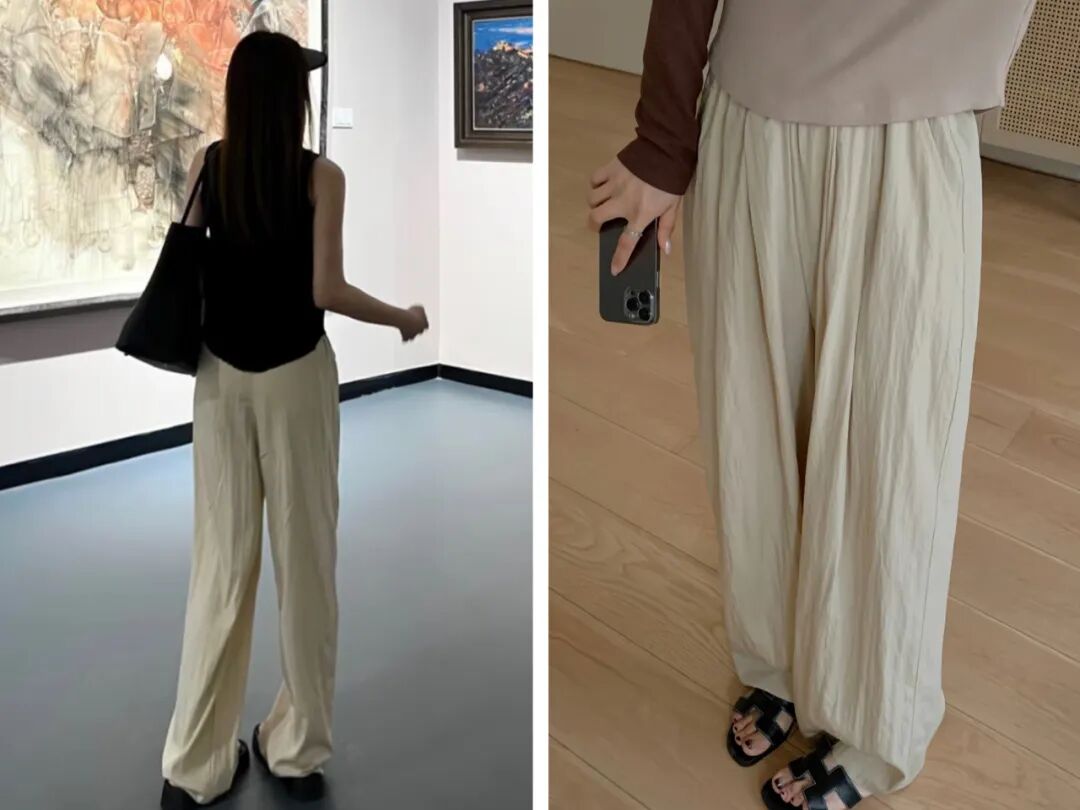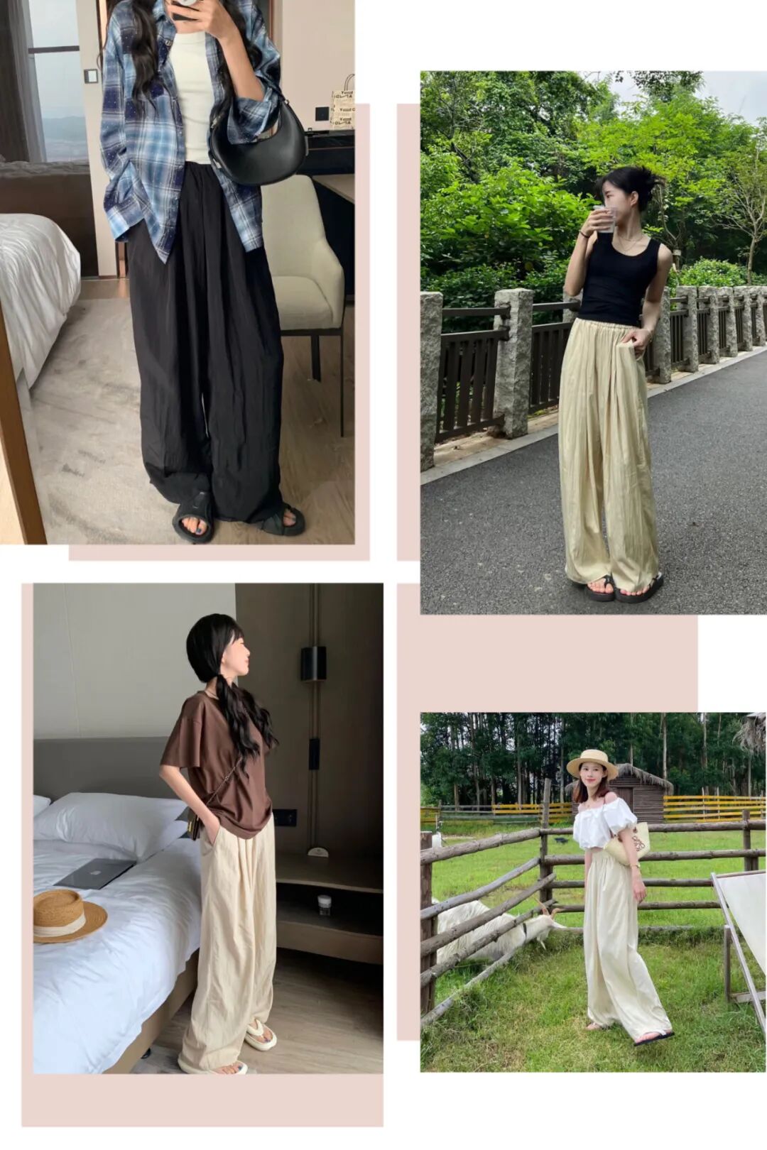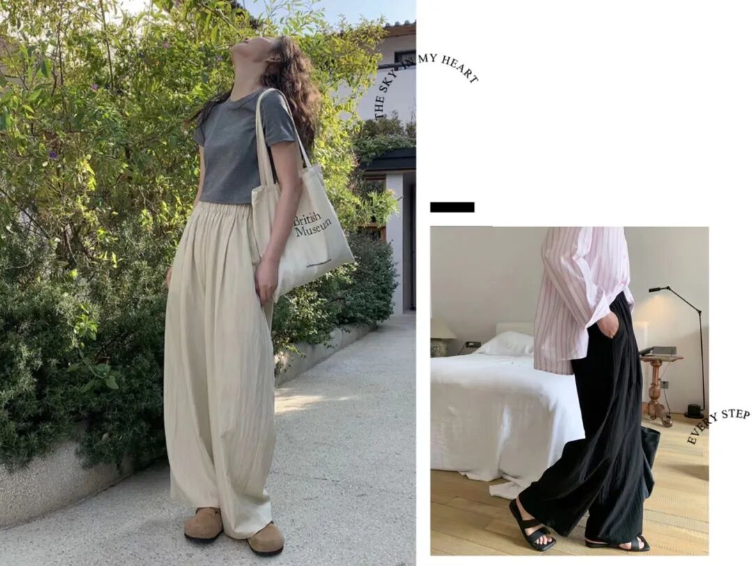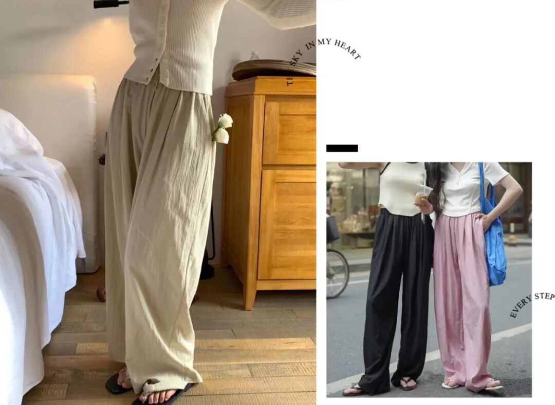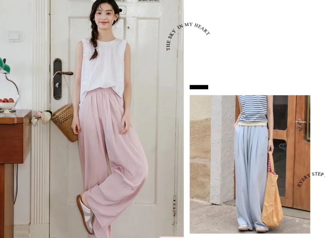 以阔腿裤作为基础原型,版型设计得更加夸张。通常是舒适凉爽的棉麻或者冰丝面料,垂度好,特别适合夏天。