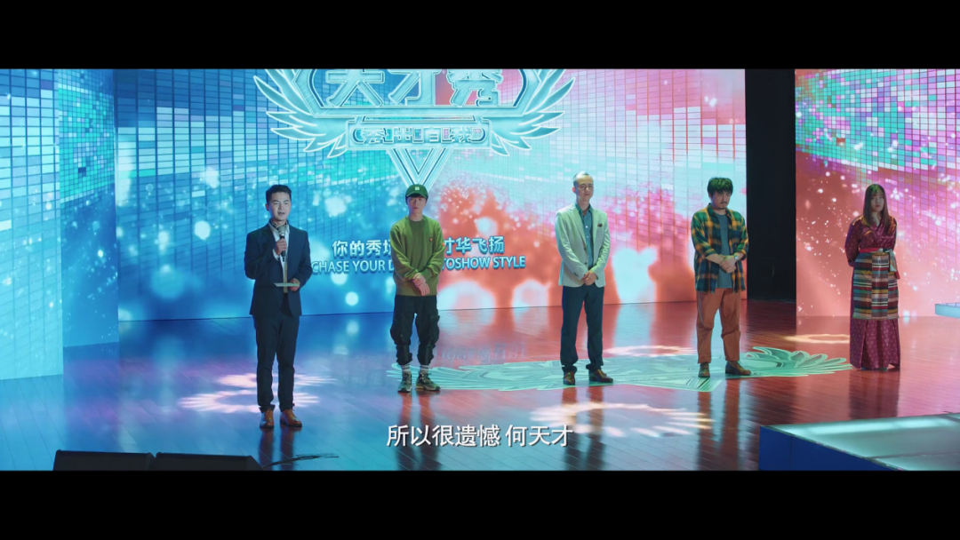 在影片的后半段,何天才没有收下邻居的钱,无望之际,一档名叫天才秀的选秀节目引起了他的注意,成为了他的救命稻草。