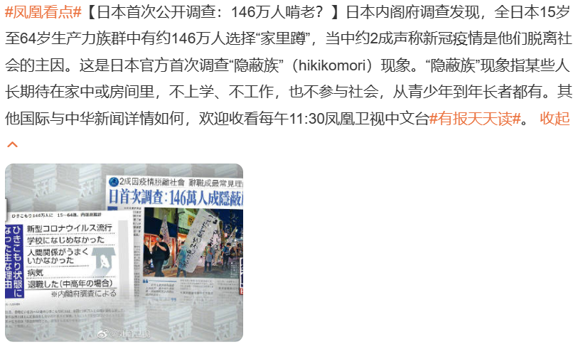 根据前段时间日本内务阁发布的调查报告显示,整个日本总共有146万的宅男宅女蛰居在家。