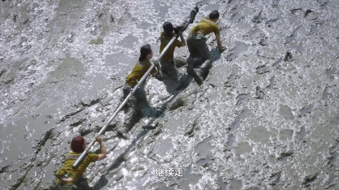 所有人只能一起在烈日泥滩中扛着旗杆,一步一步艰难地往回走。