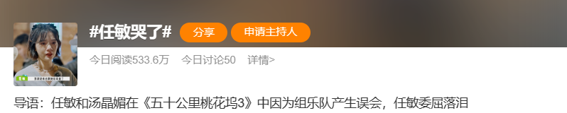 九分钟的节目片段冲上了两个热搜词条——#汤晶媚组乐队没带任敏##任敏哭了#,甚至让网友连吵了三天。