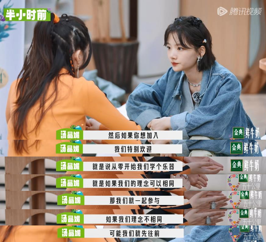 但在节目最新放出的花絮中,汤晶媚在去找其他人组队时有明确表示过,乐队是任敏的想法。