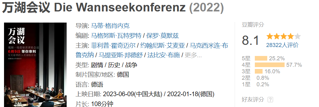 影片根据真实历史改编,讲的是在1942年1月20日的万湖会议上,纳粹高官商讨如何对犹太人施行种族灭绝。