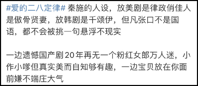 之所以有人不接受秦施的不完美人设,说到底还是因为剧本不行,没能让这个角色打动观众罢了。