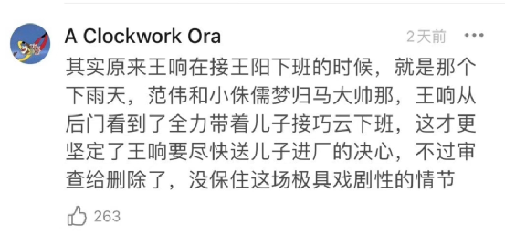 其中有一场大家都觉得可惜的戏,是王响去维多利亚接王阳,看到巧云的老公带着孩子接她下班,王响不想见了面尴尬,没接到儿子就走了。