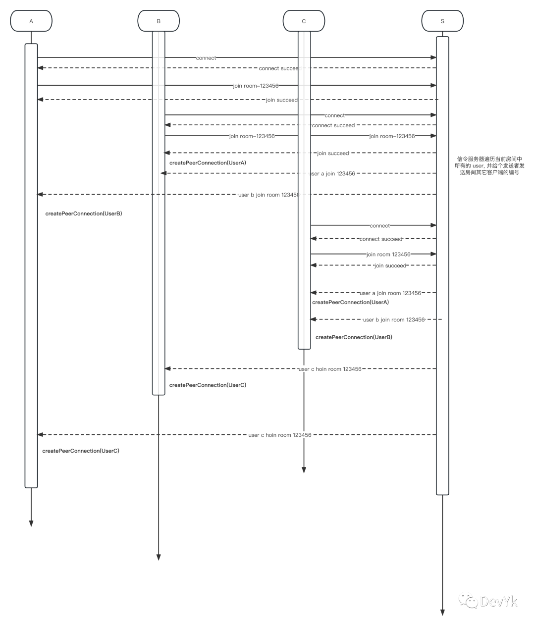 加入房间的回调跟之前有点不一样,当有新用户加入进来时,信令服务器需要将房间内除自己的 remoteId 告知当前用户,并且再把当前加入进来的用户告知其它用户。因为各自需要根据 remoteId 去创建 PeerConnection.