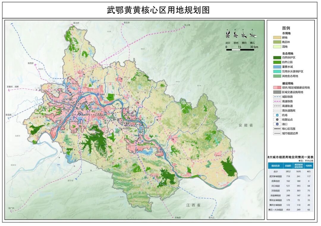 本版本根据网传《武鄂黄黄规划建设纲要大纲》中的《武鄂黄黄核心区用地规划图》(下图)为基准优化调整调整,供大家参考。