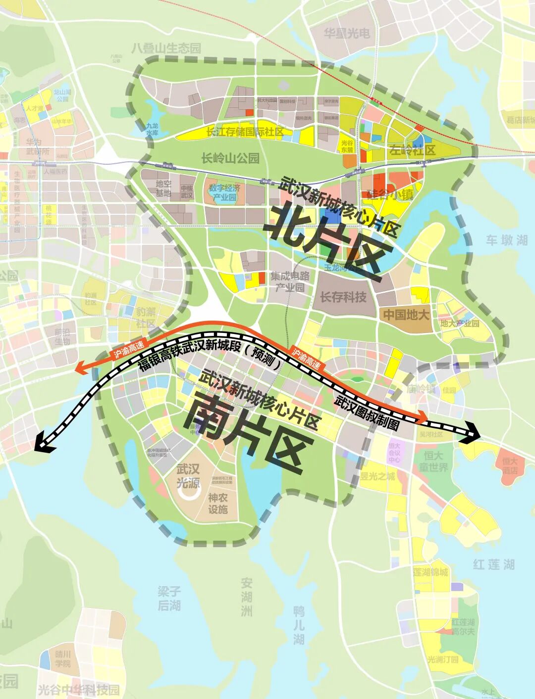 考虑到落地性,这条通道大概率沿沪渝高速公路南侧绿地区域,横穿武汉新城核心片区,将核心片区分为南北两大片区。