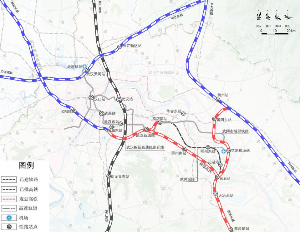 可以确定的是《武鄂黄黄规划建设纲要大纲》中图示已明确,福银高铁东西向横穿武汉新城核心区。