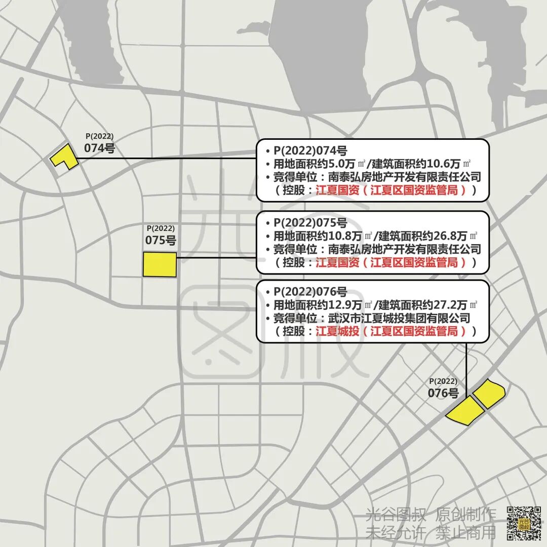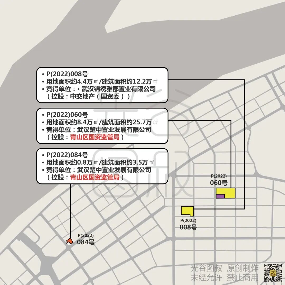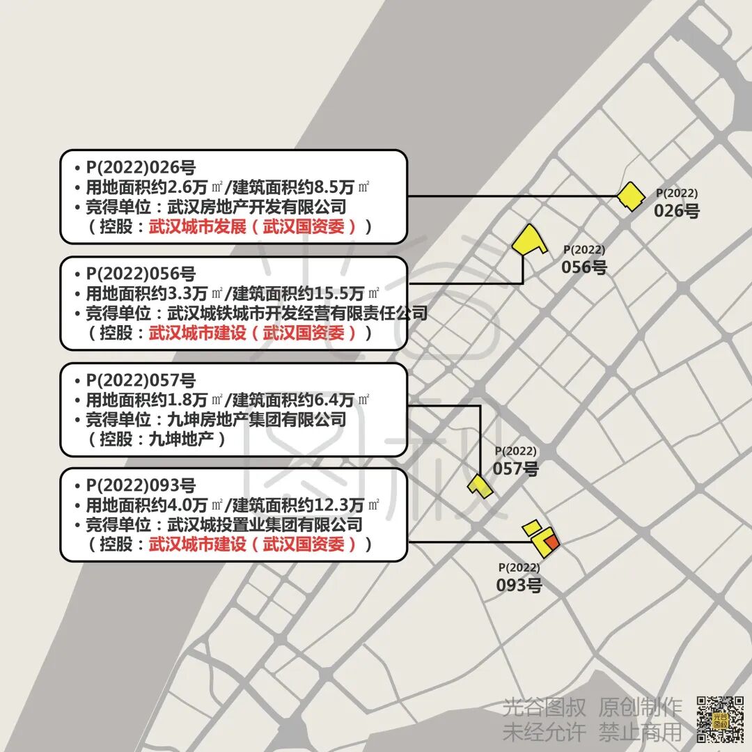 主要集中在武昌滨江商务区以北区域,除规模最小的057号地被民企九坤地产竞得,其他3块(026号,056号,093号)均为武汉国资委控股公司竞得。