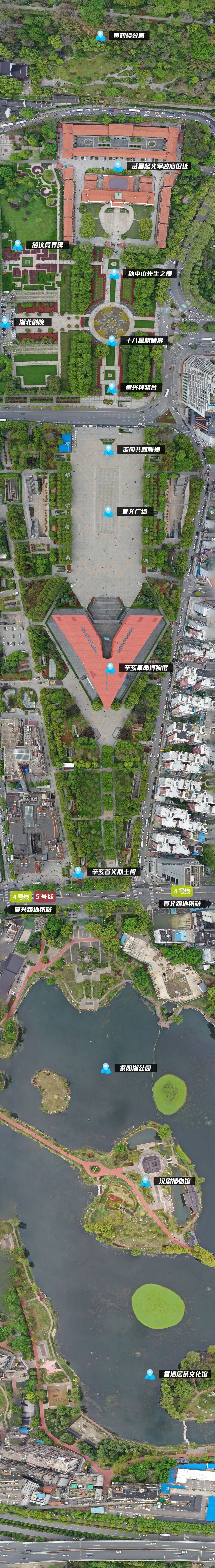 首义广场,位于武昌区阅马场,广场由南北向的纪念轴和东西向的文化景观轴组成,交汇于广场中心的十八星旗喷泉。广场北部,有俗称“红楼”的武昌起义军政府旧址,是辛亥革命的标志性景观。广场中部立有孙中山先生及走向共和的雕像。2011年,为迎接辛亥革命100周年,广场南部新建的辛亥革命博物馆正式开放,南北广场也融为了一体。