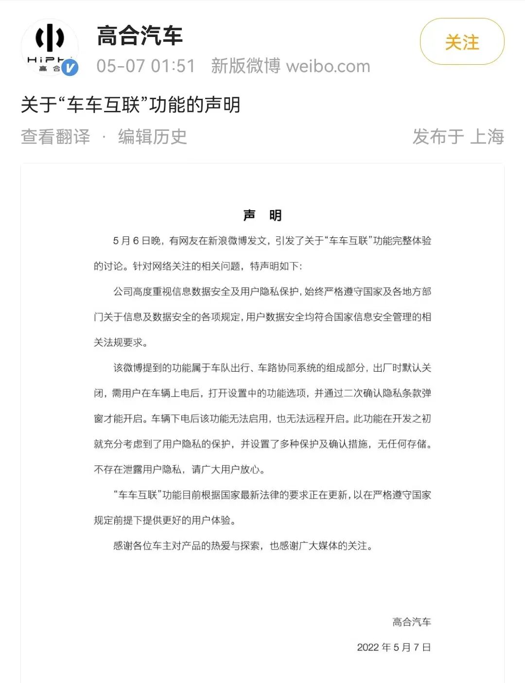 随后,高合汽车发布声明称,该功能属于车队出行、车路协同系统的组成部分,出厂时默认关闭,需用户在车辆上电后,打开设置中的功能选项,并通过二次确认隐私条款弹窗才能开启。车辆下电后该功能无法启用,也无法远程开启。