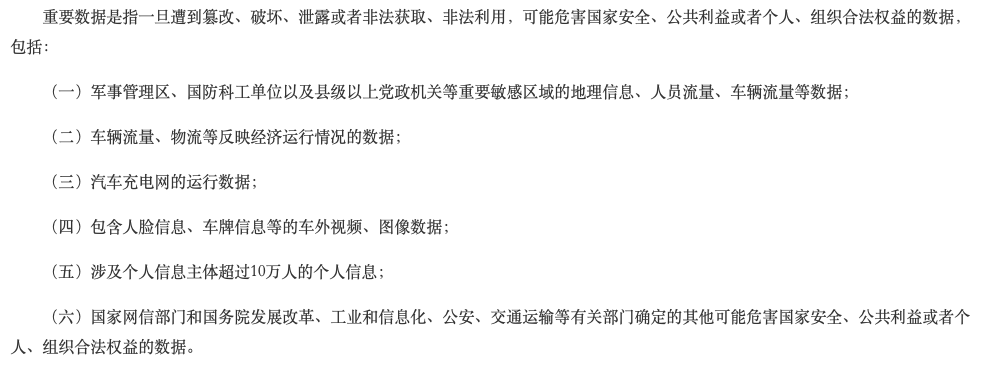 除人脸信息外,《规定》中还明确提到,国防科工单位、车牌信息等车外视频、图像等都属于重要数据。