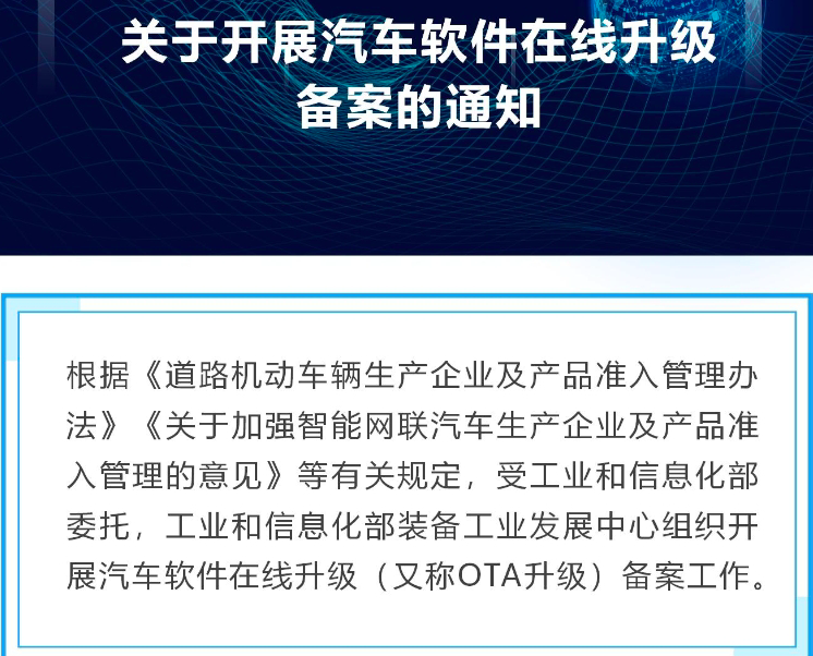 今年4月份,工信部下发了《关于开展汽车软件在线升级备案的通知》,通知中明确规范了关于OTA升级的方方面面:企业应履行告知义务,升级执行前向车辆用户告知OTA升级的目的、内容、所需时长、升级影响、注意事项等信息,升级执行后告知车辆用户升级结果。