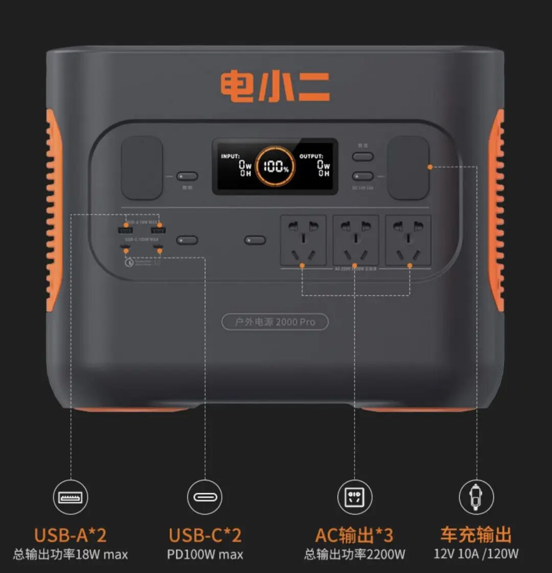 2000pro是华宝新能旗下户外电源品牌——电小二,于今年5月发布的旗舰产品,这款户外电源电池容量为2160Wh,电池功率为2200W,可用太阳能充电。