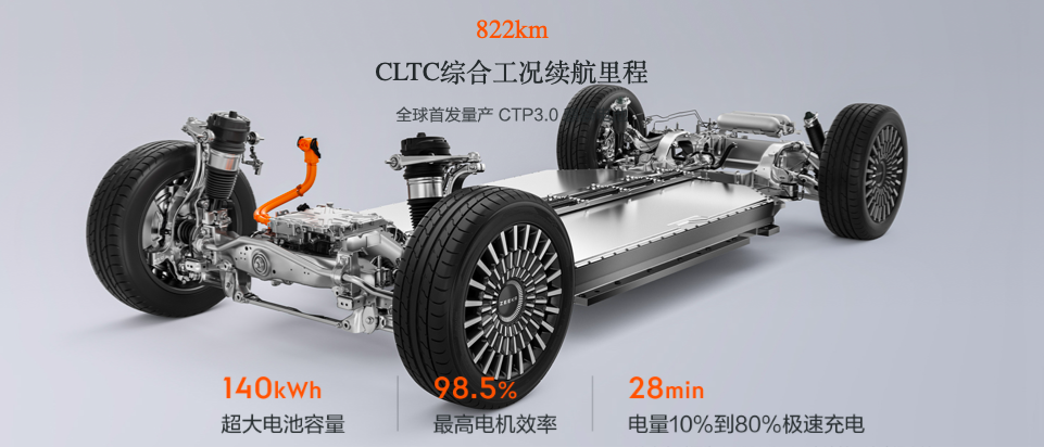 极氪009 WE版 116kWh搭载极芯电池包,CLTC综合工况续航里程为702km,极氪009 ME版 140kWh全球量产首发搭载宁德时代的CTP 3.0麒麟电池,CLTC综合工况续航里程是822km。