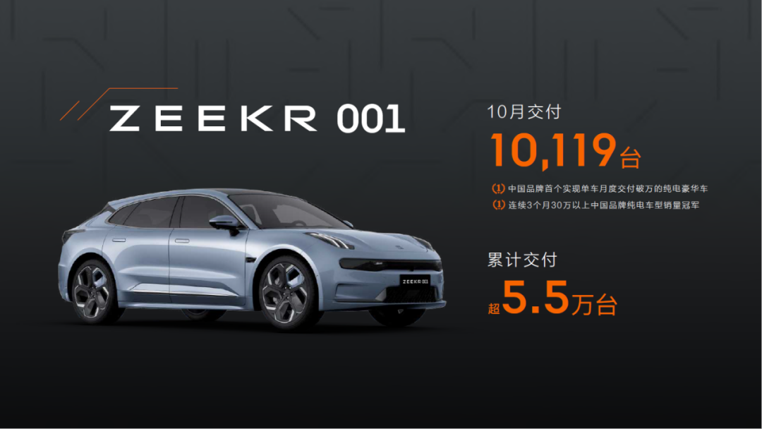10月份,极氪001在交付10119台,环比增长22.3%,目前极氪累计交付量超5.5万台,平均大定订单金额超过33.6万元。