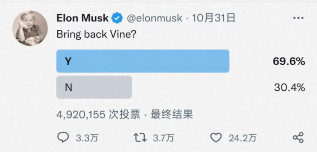 10月31日,马斯克在推特上发起了一项投票,询问人们是否让短视频项目Vine重新回归。截止到投票结束,参与投票的492万人,有69.6%的人选择了“是”。