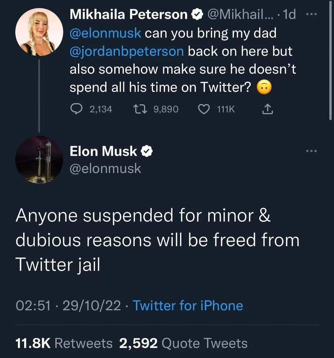 10月28日,马斯克发布一条推特,稍微澄清了一下情况,并希望任何恢复被封账户的决定都将以平衡和客观的方式做出。